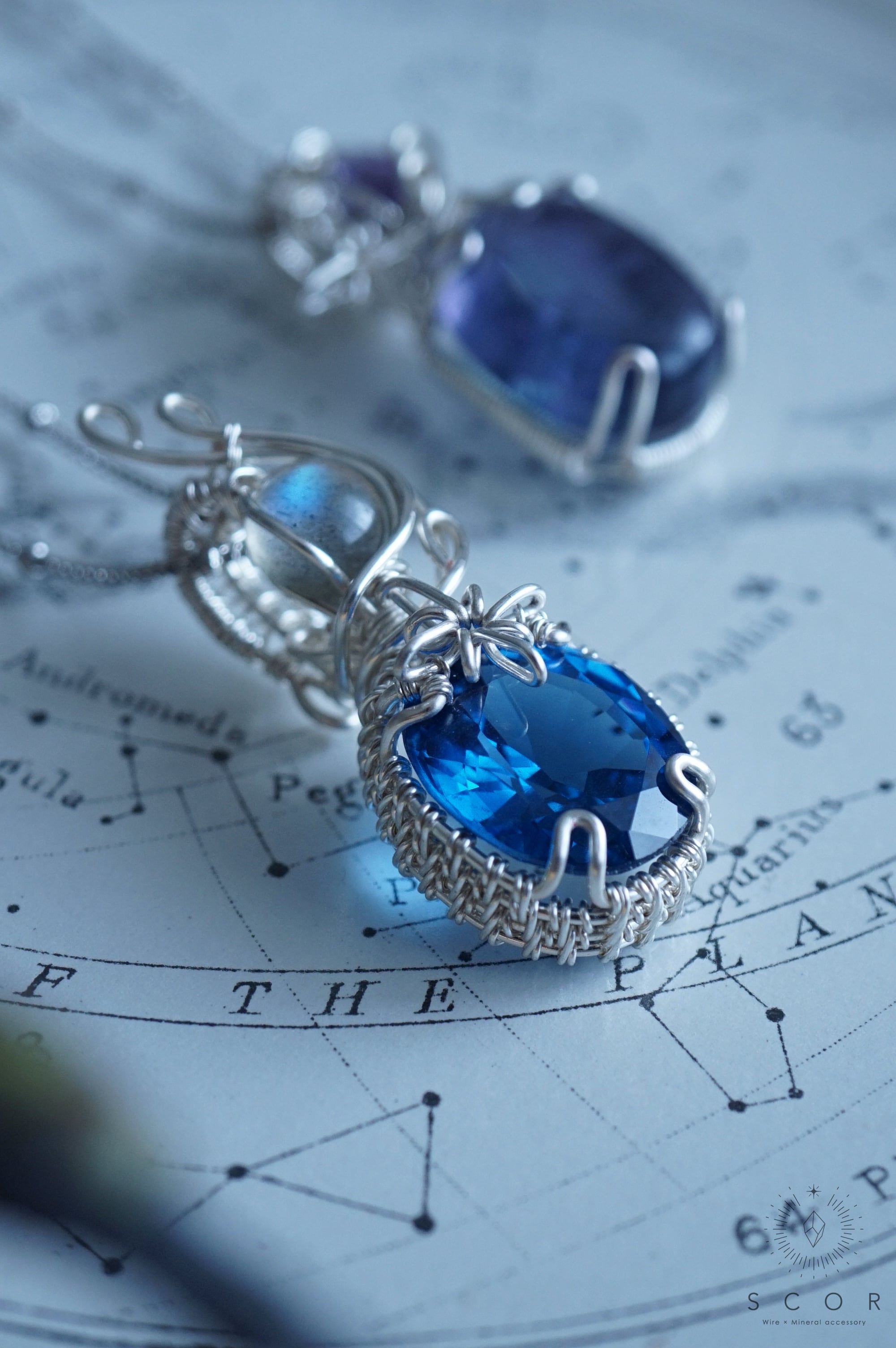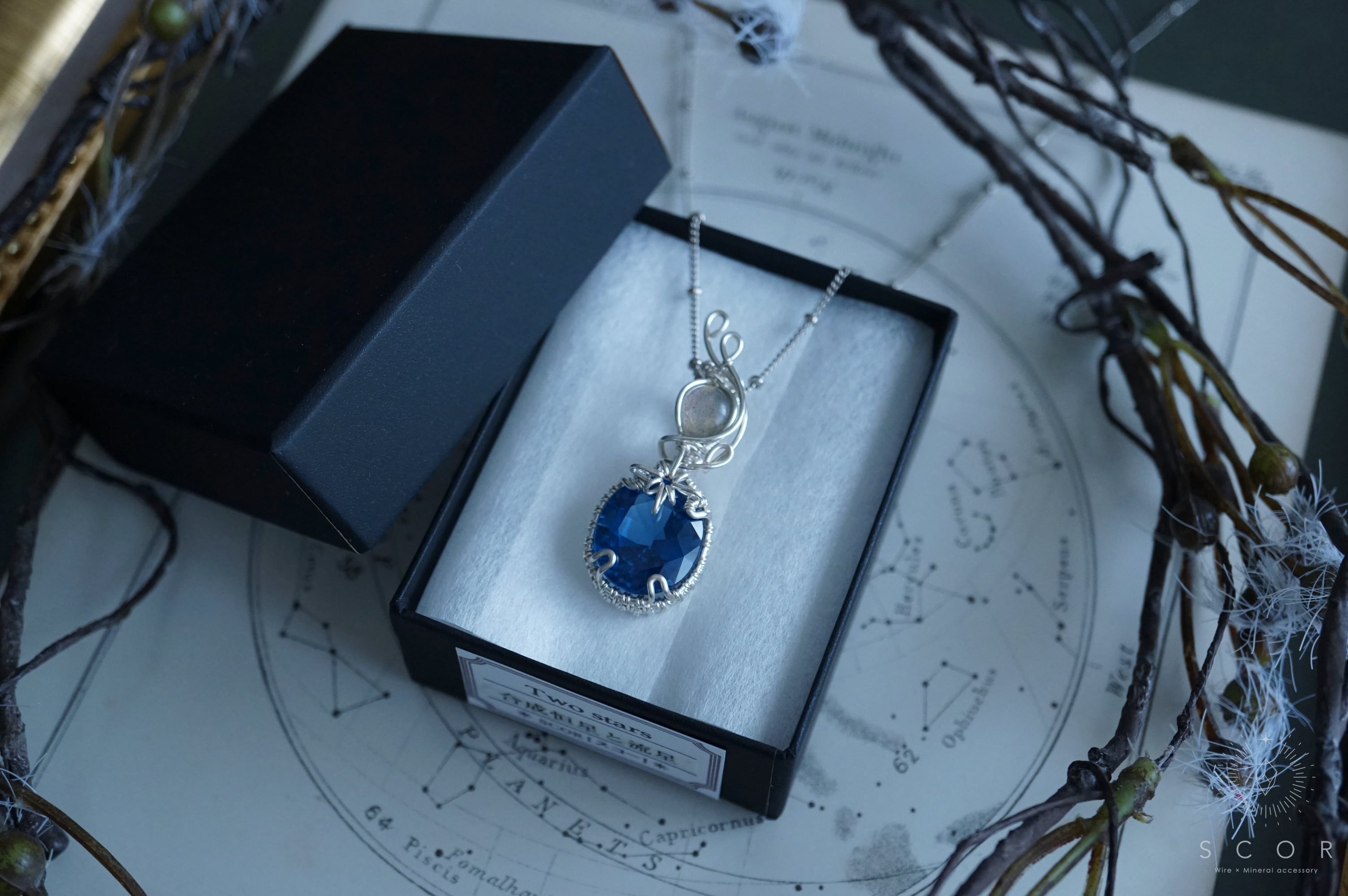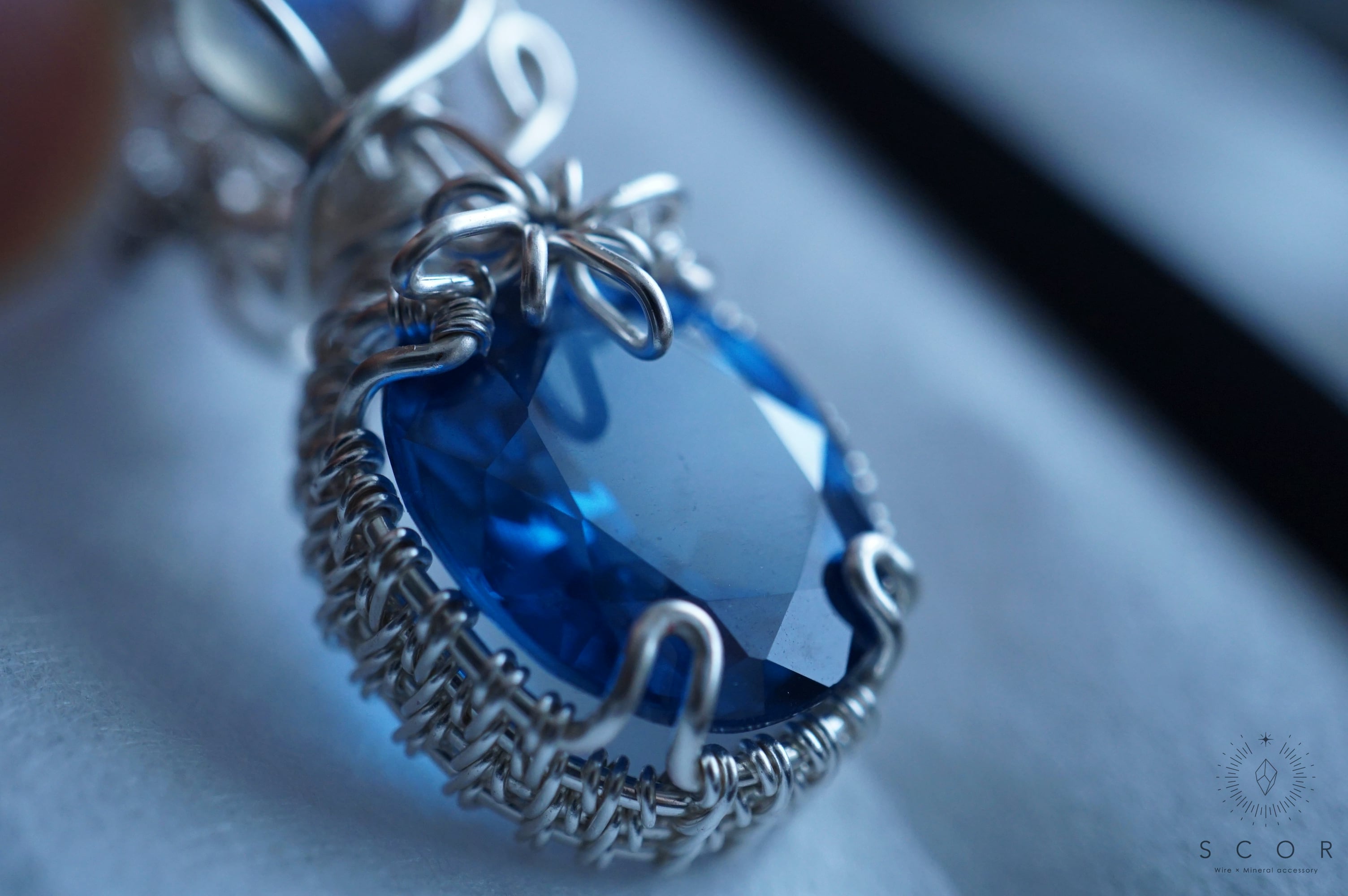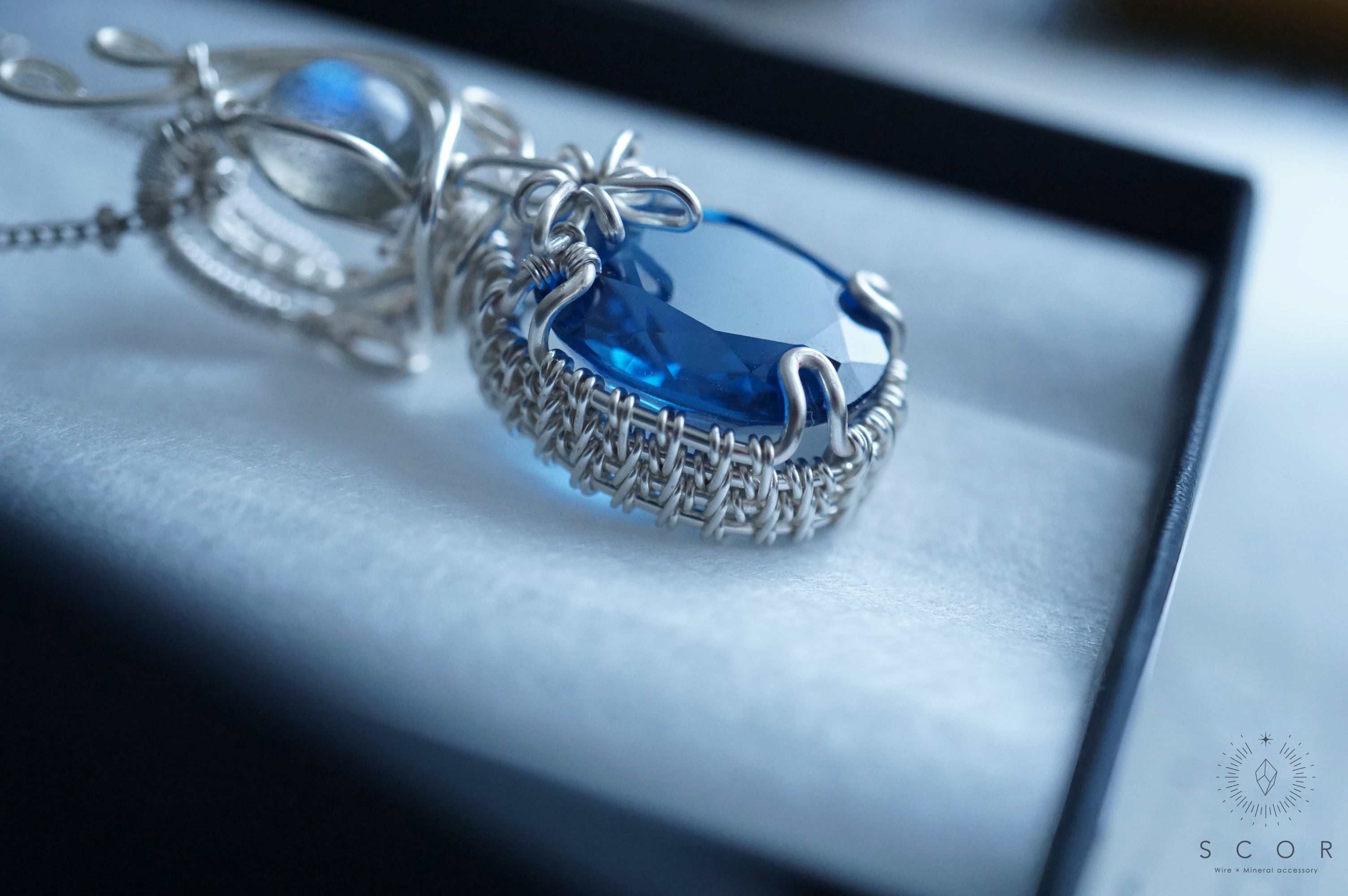 合成ブルースピネルの上部に重ねた光芒型のワイヤーモチーフは、長い尾を引いた流星のイメージ。