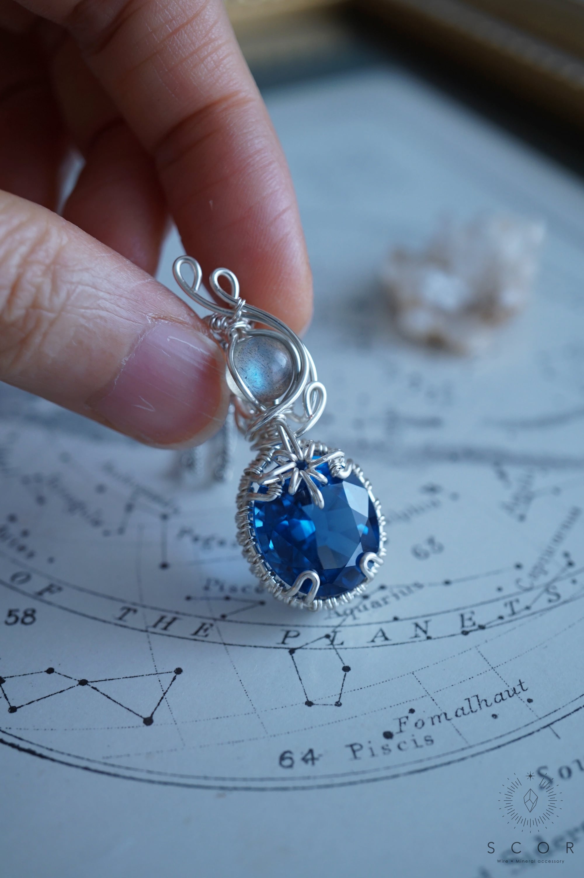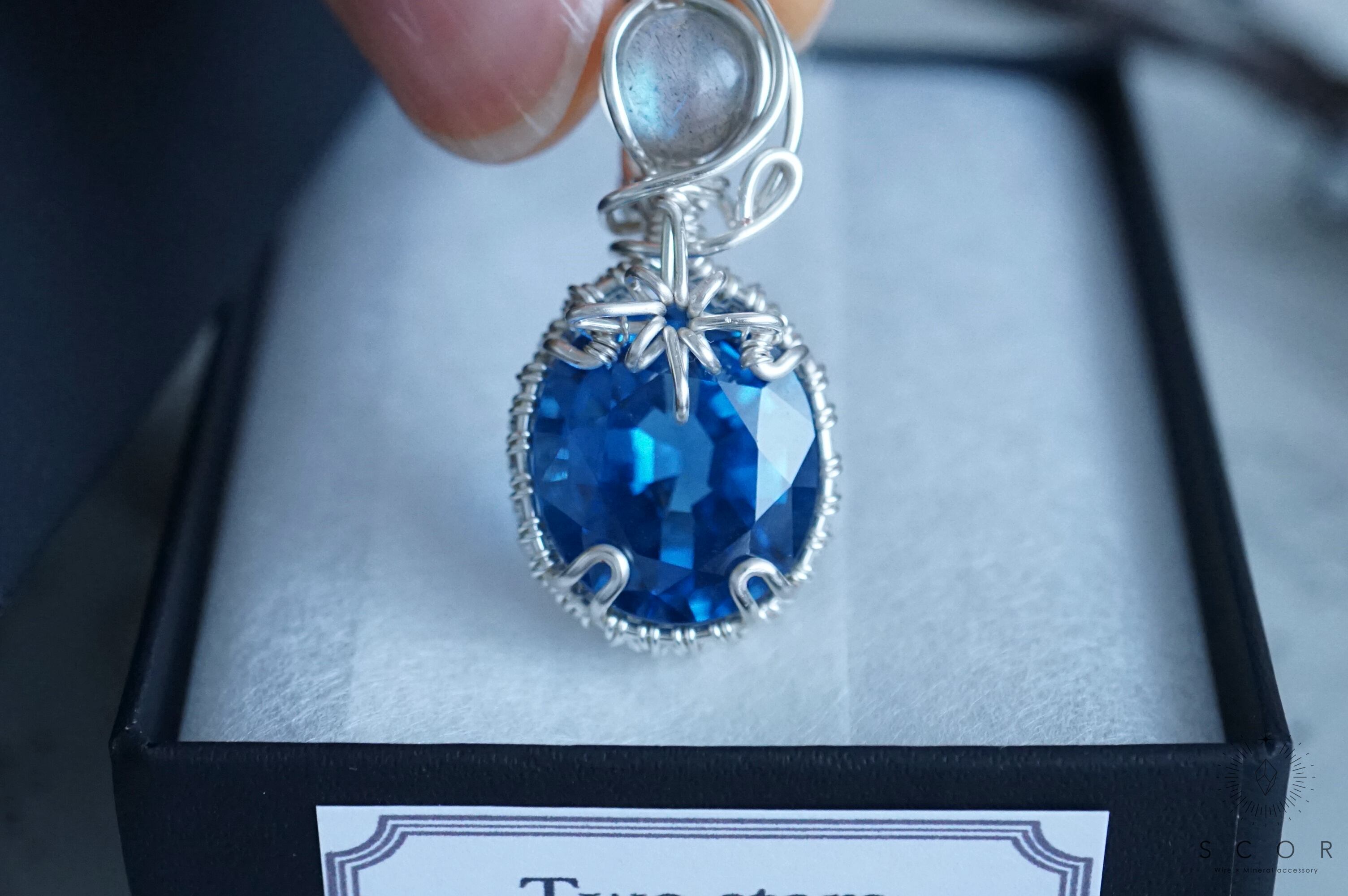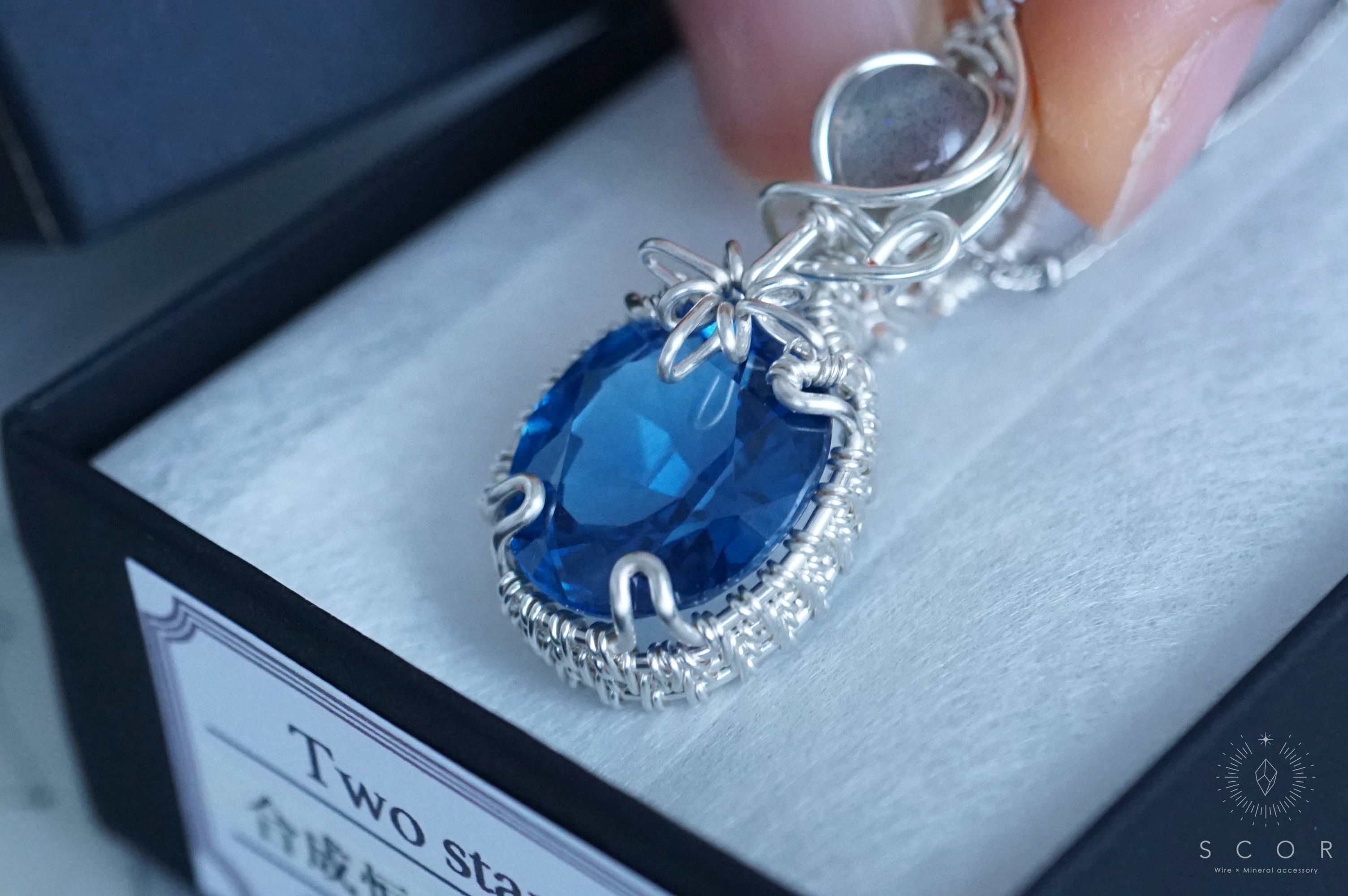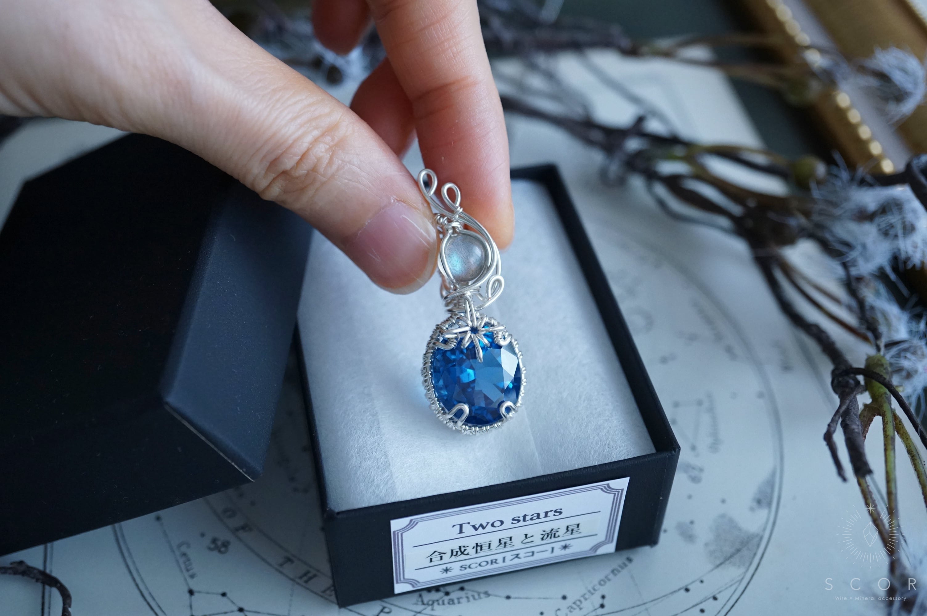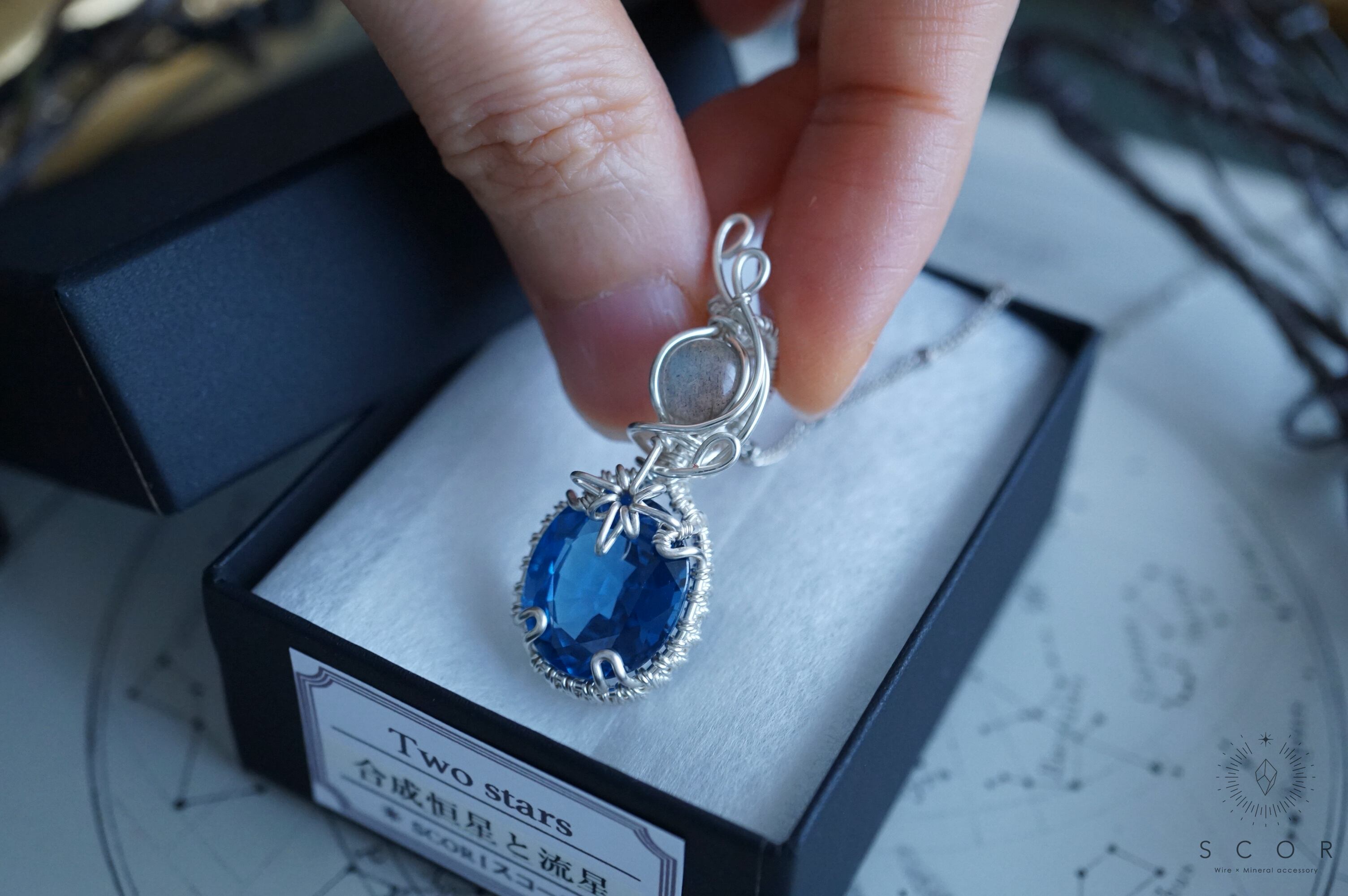 【動画あり】Two stars - 合成恒星と流星 (pt424-gl-s)(合成ブルースピネル ラブラドライト ペンダントトップ)