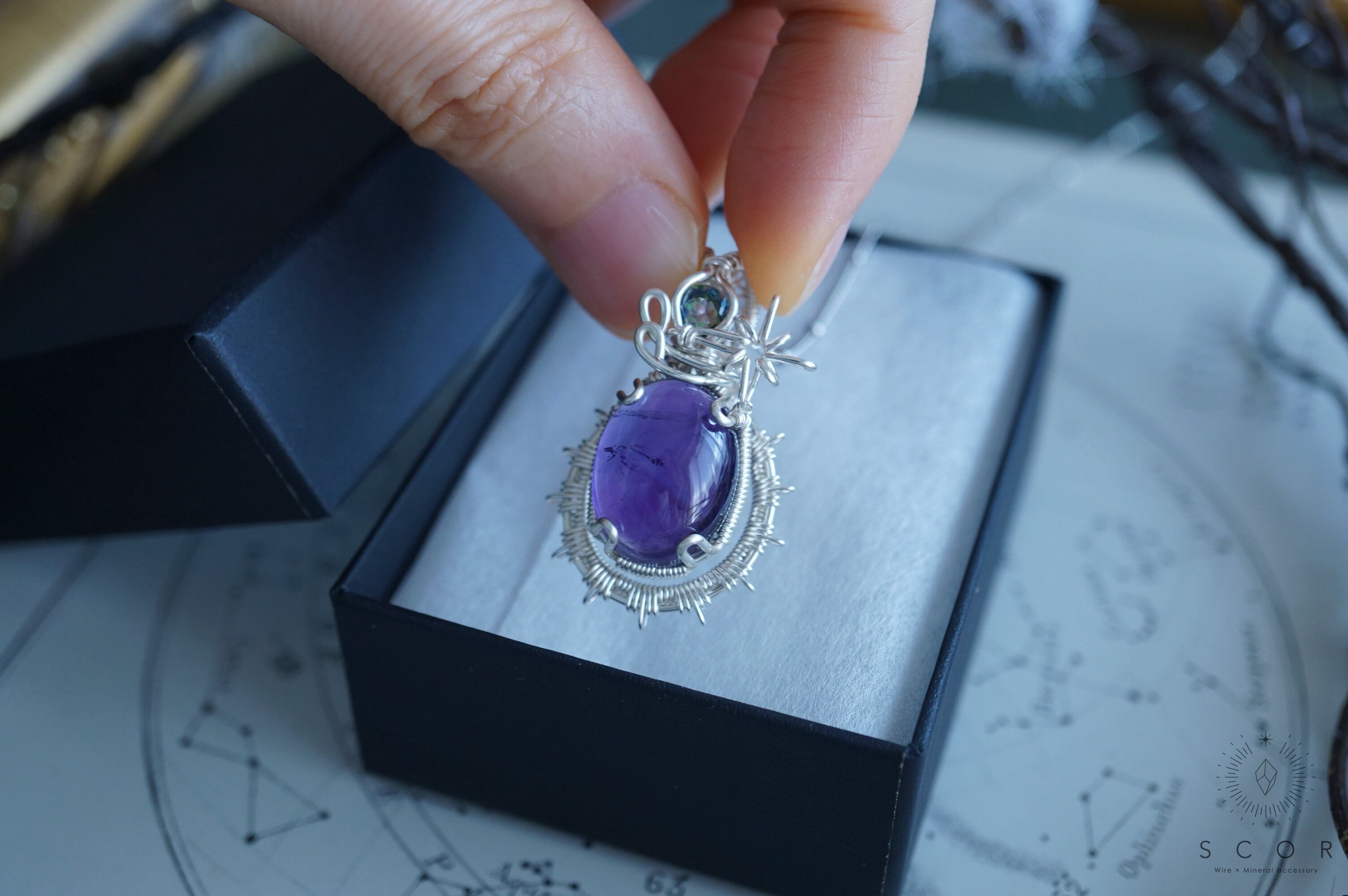 白や淡い色の服と合わせると、アメジストとミスティッククオーツの透明感と石色が引き立ちます。