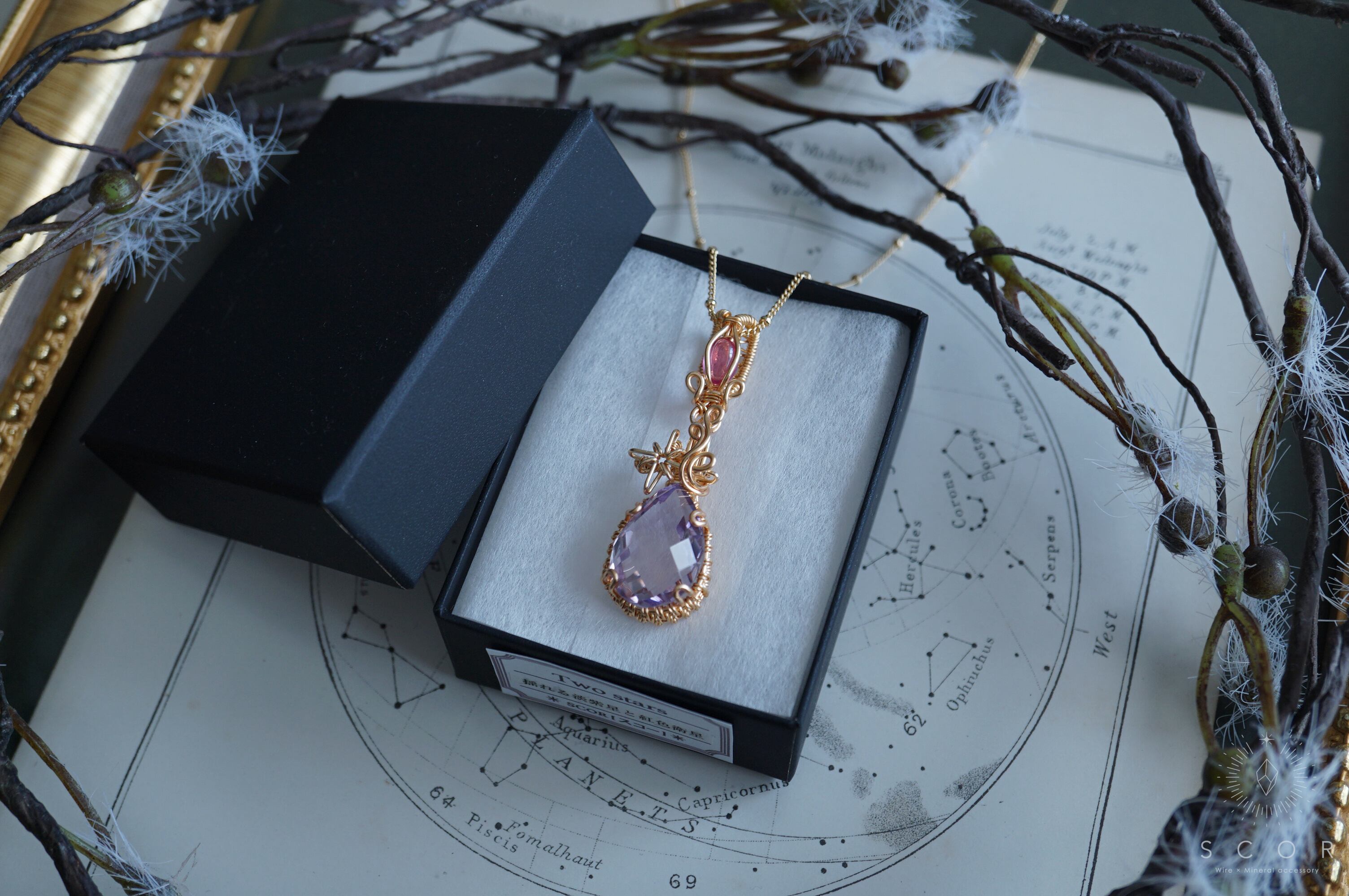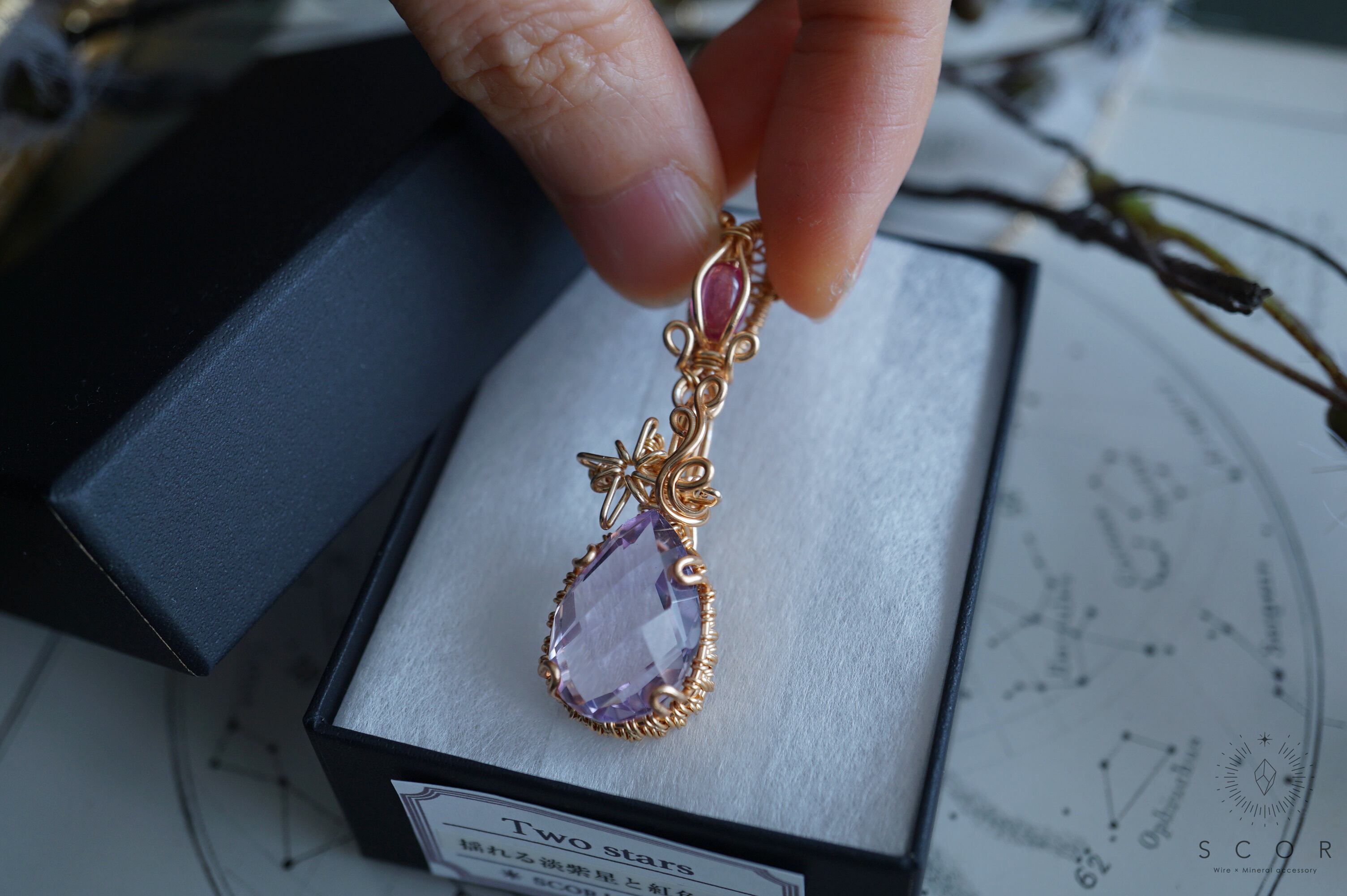 こだわりの石2つを星々に見立て、その煌めきをワイヤーモチーフで表現したTwo starsシリーズ。