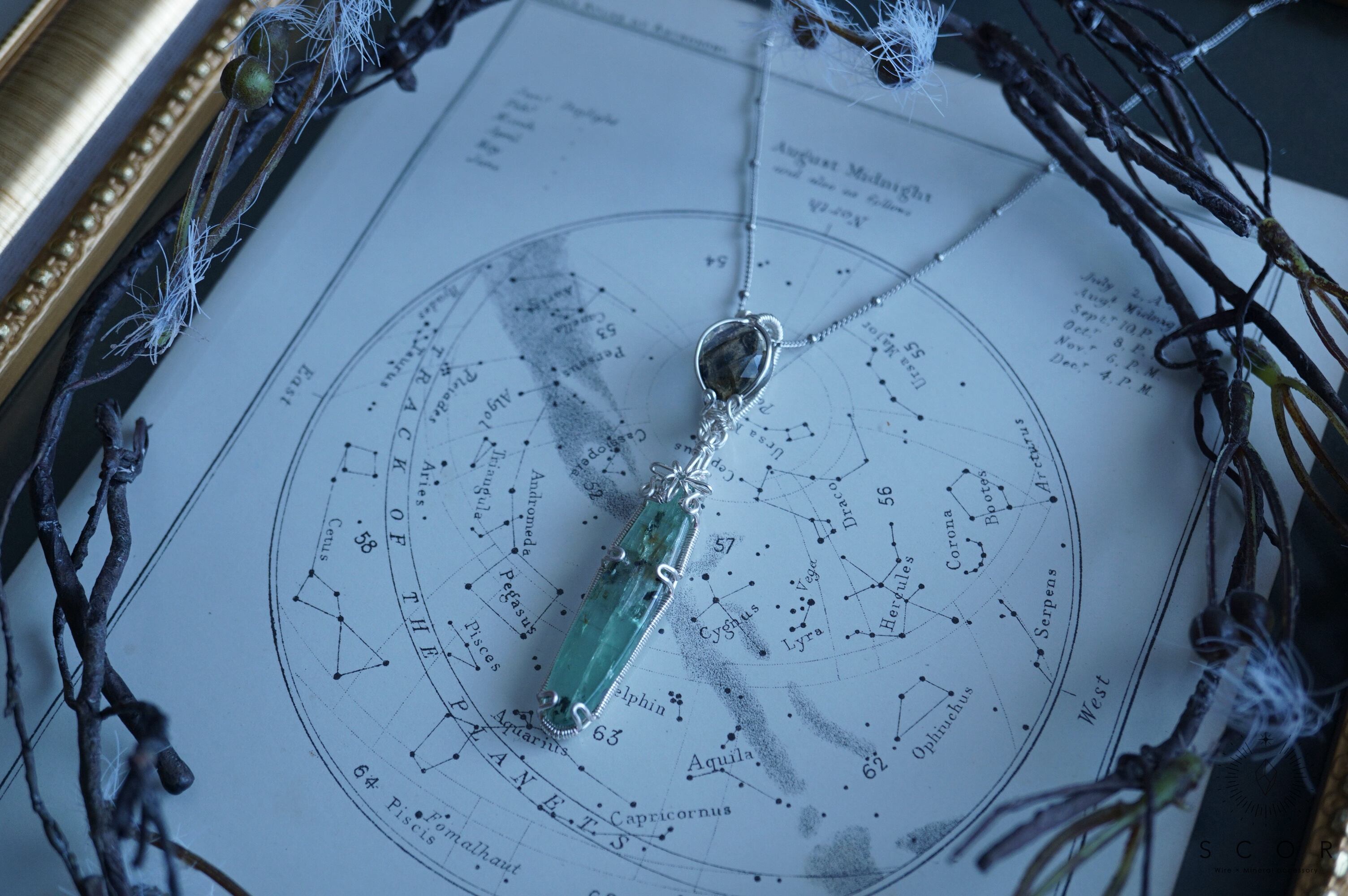 カイヤナイトは、細長い形状のカボションを使用。
