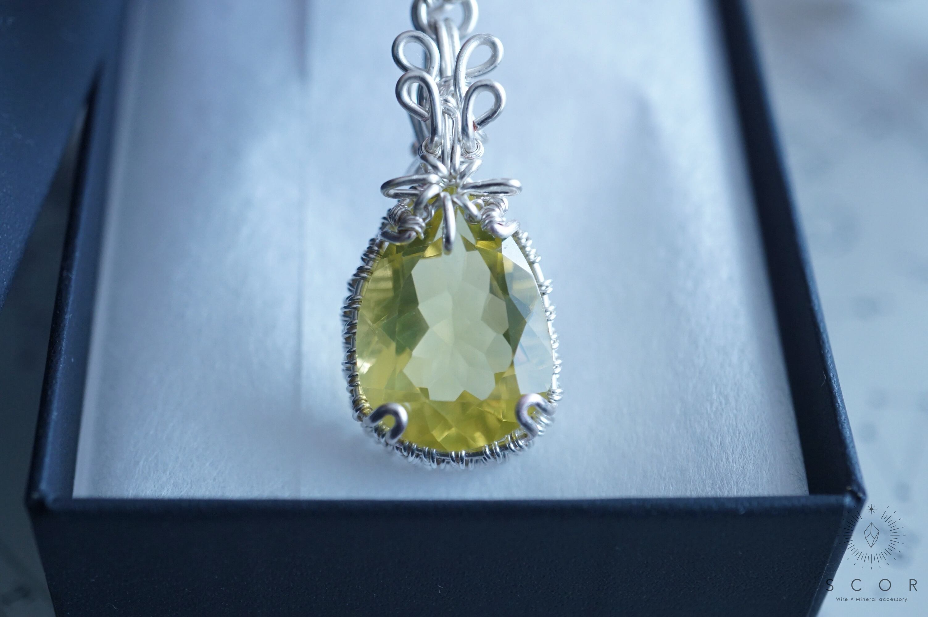 レモンクオーツに重ねた光芒型のワイヤーモチーフは、流星を表現。