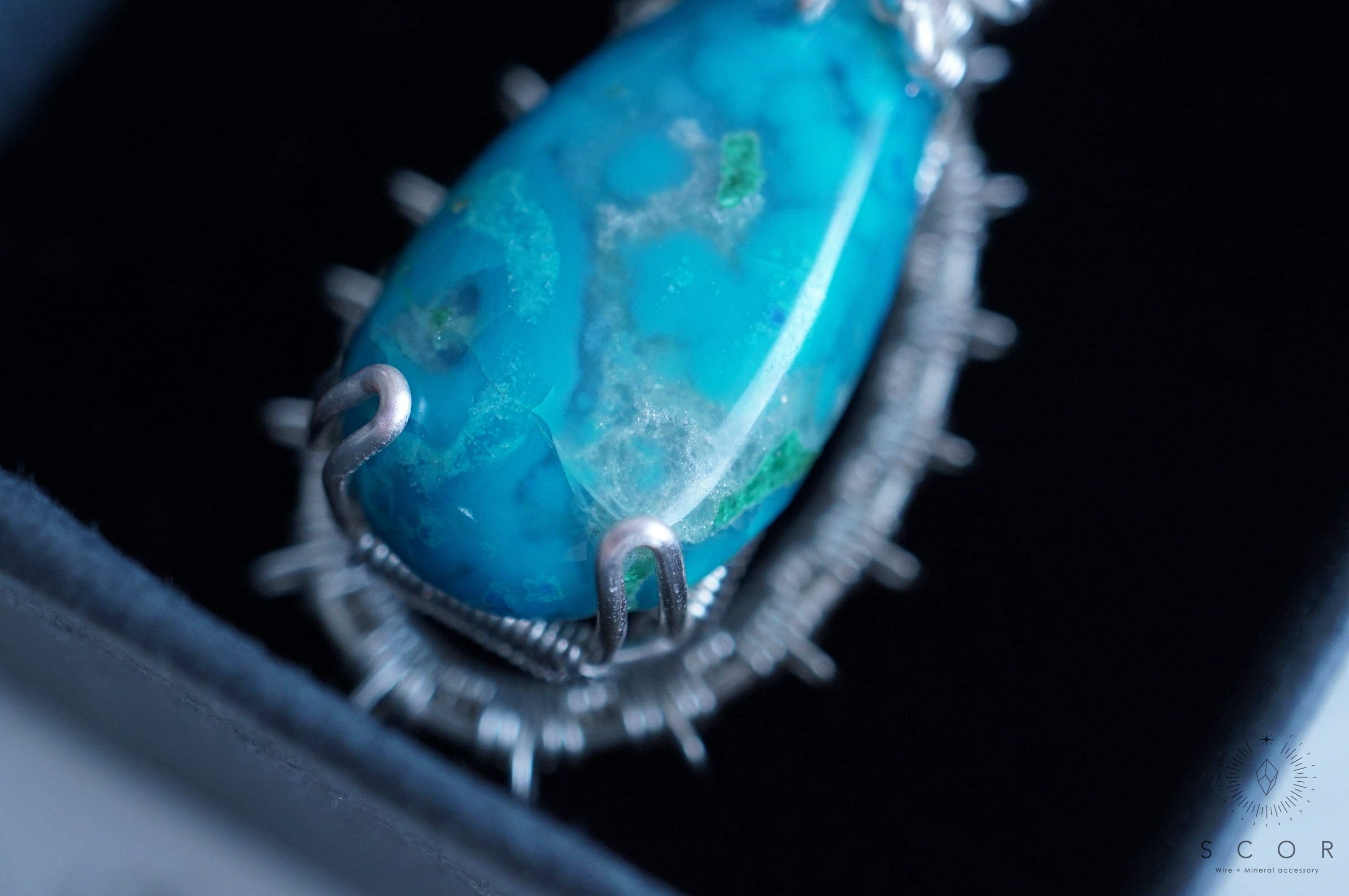 蛍光色に近い、濃く鮮やかな水色のシャッタカイトが、無色透明な水晶の湖に封じ込められているような、大変ユニークなピースです。