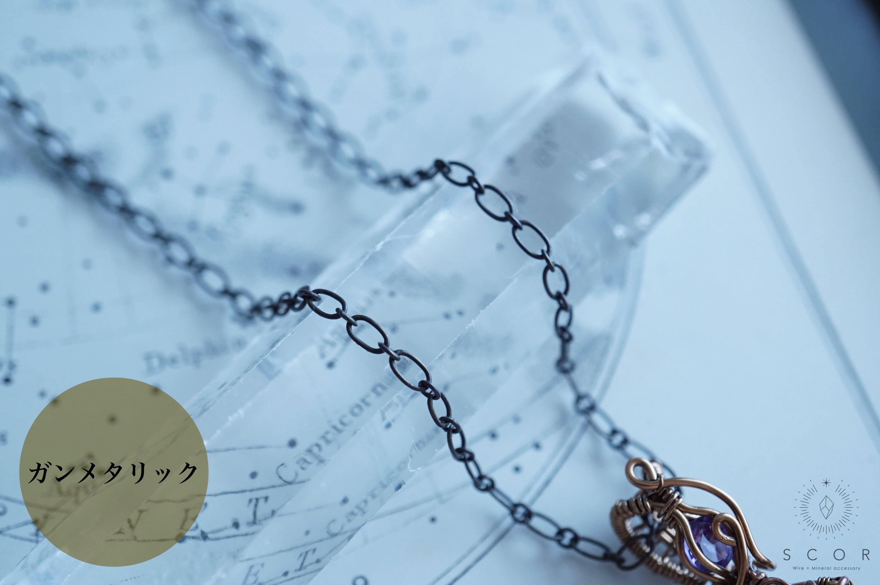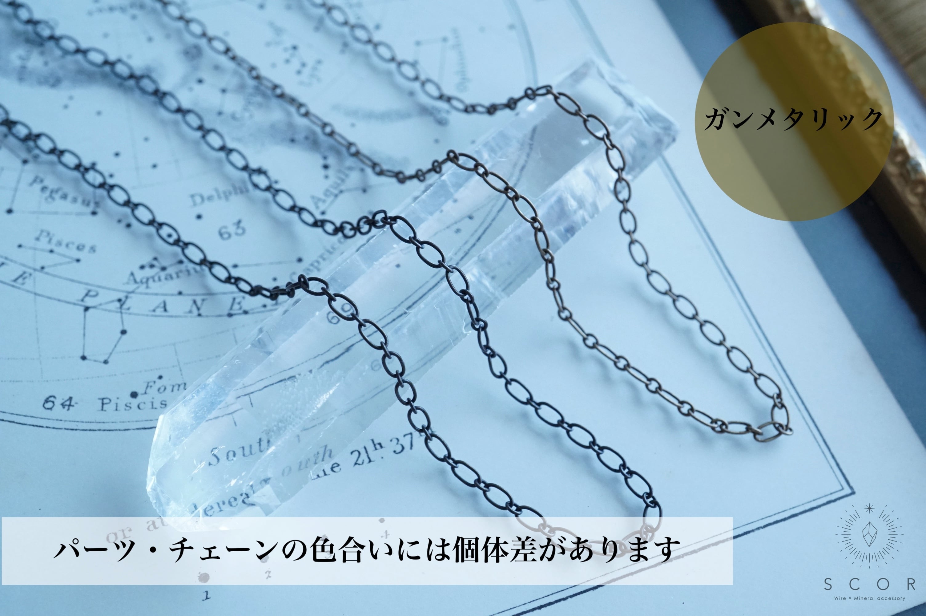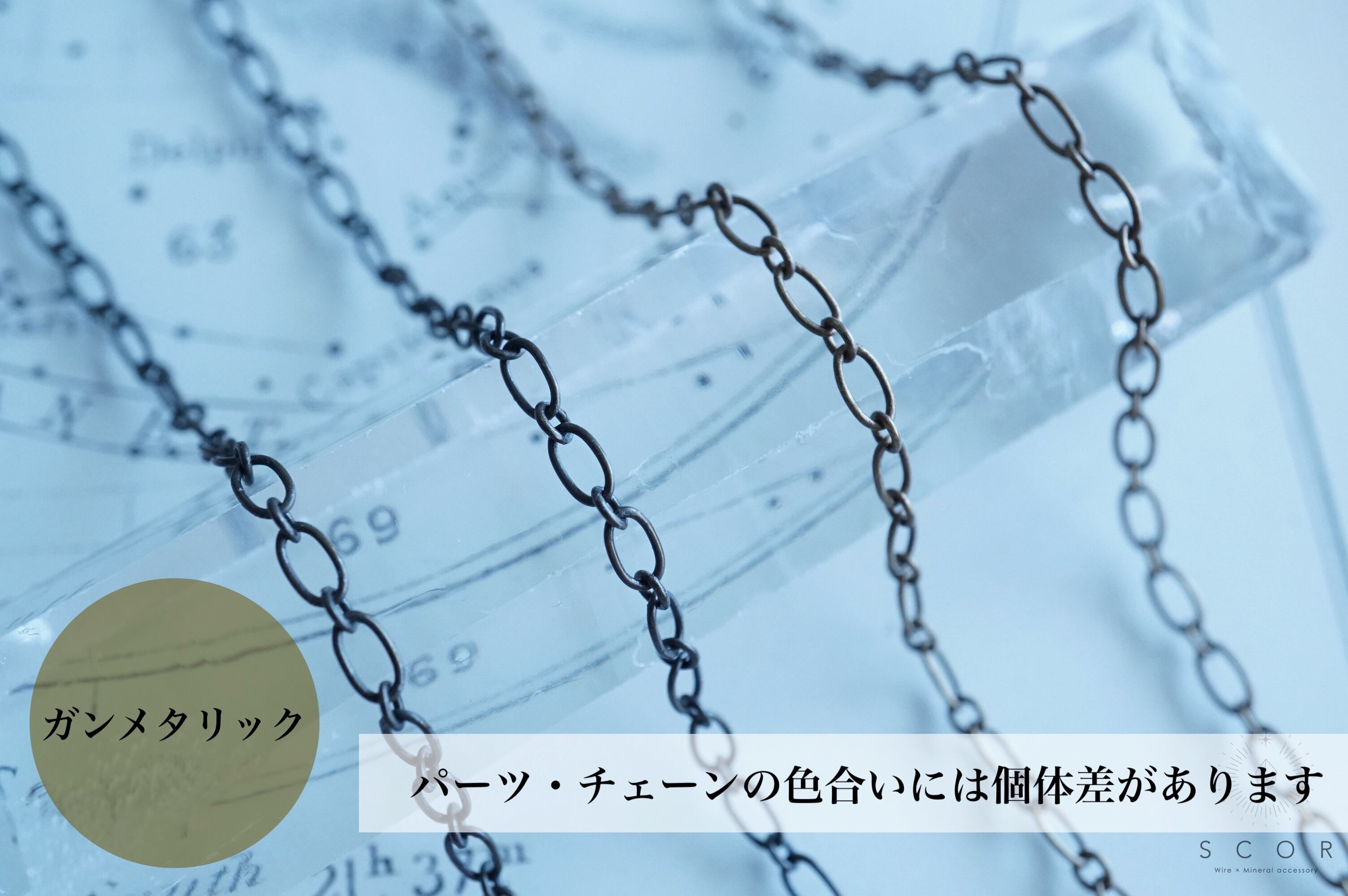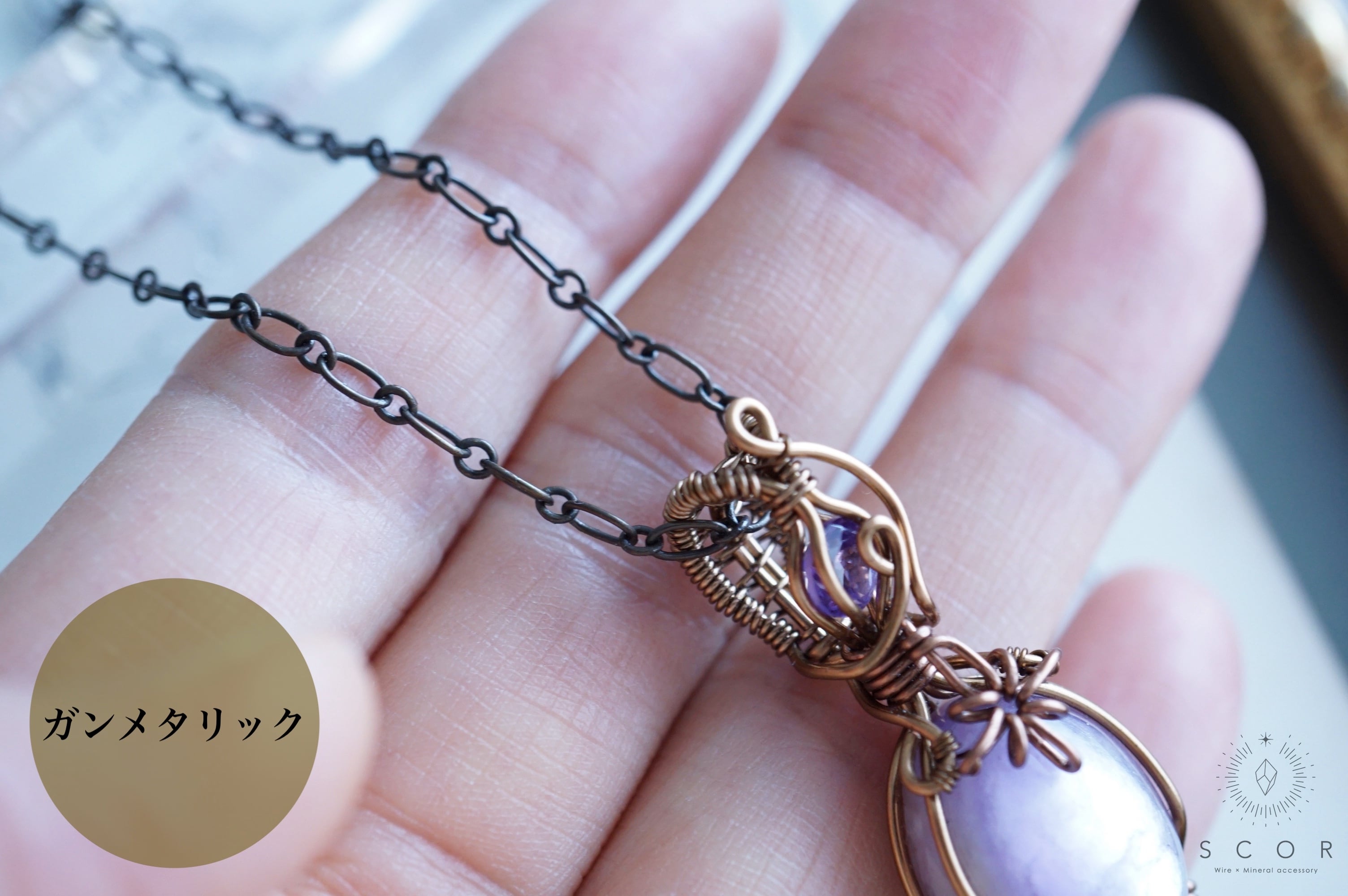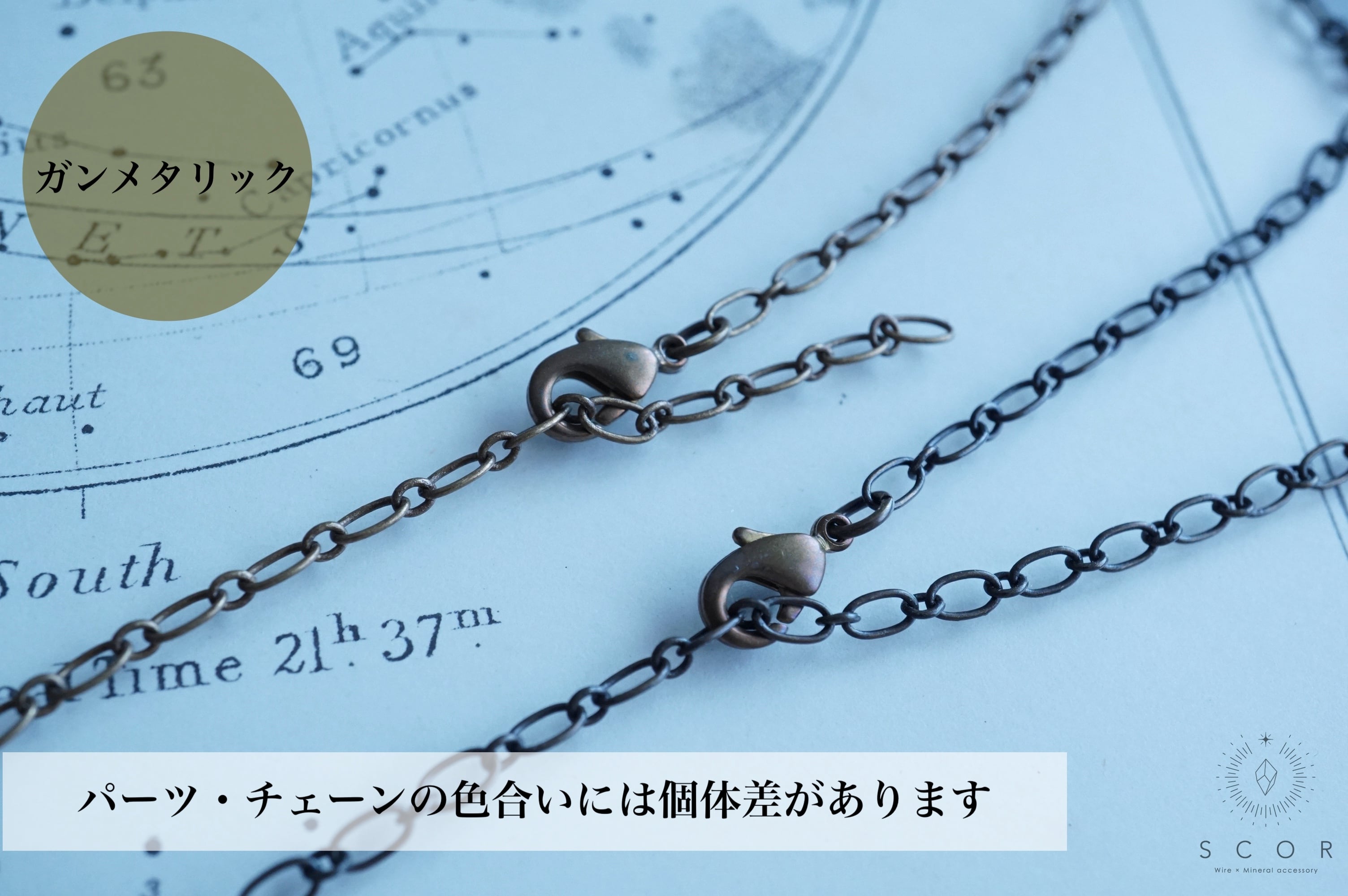 ペンダントトップに使用しているガンメタリックワイヤーとの色合いや、ネックレスを構成する各パーツの色合いにも差異があります。
