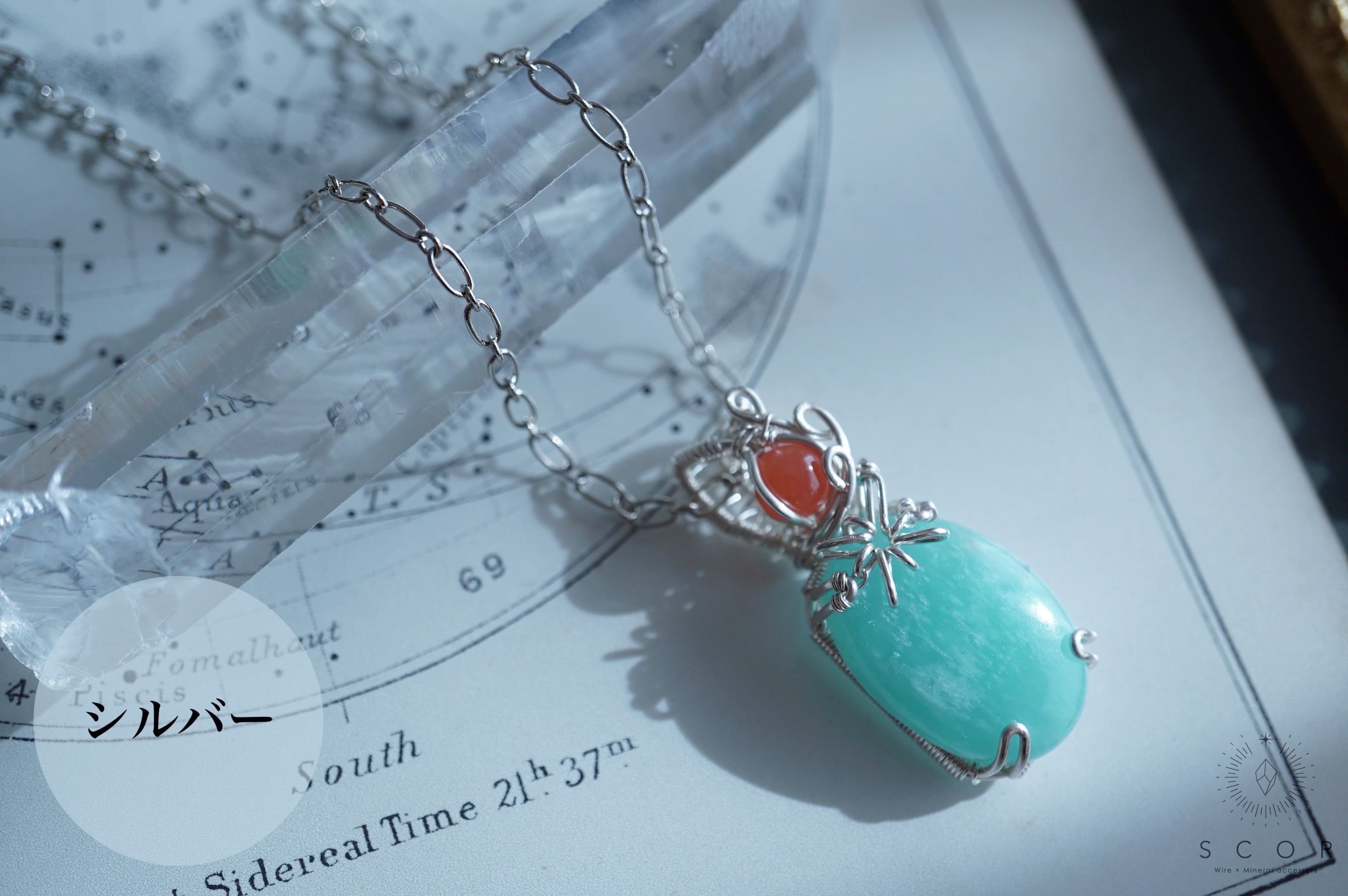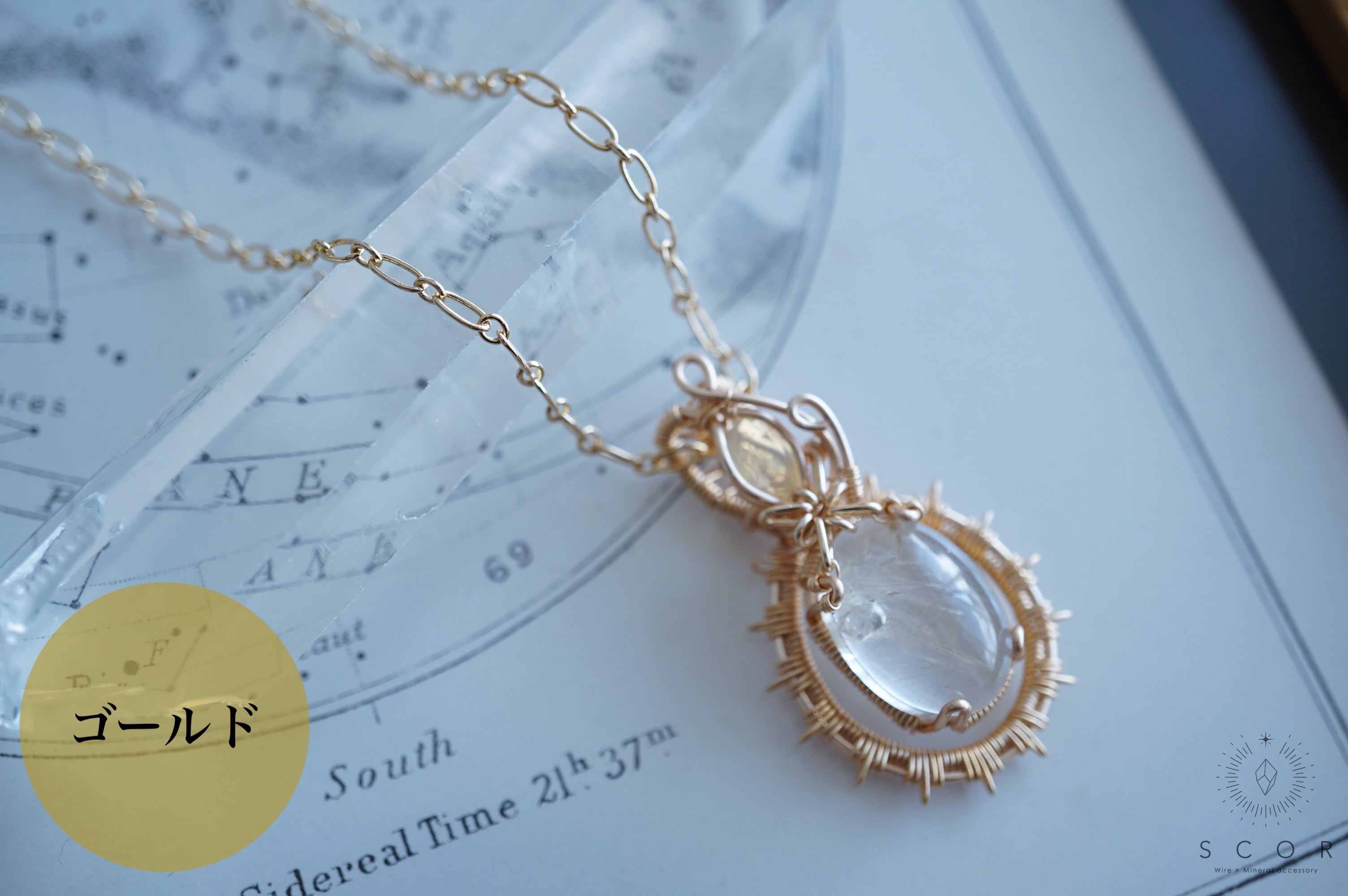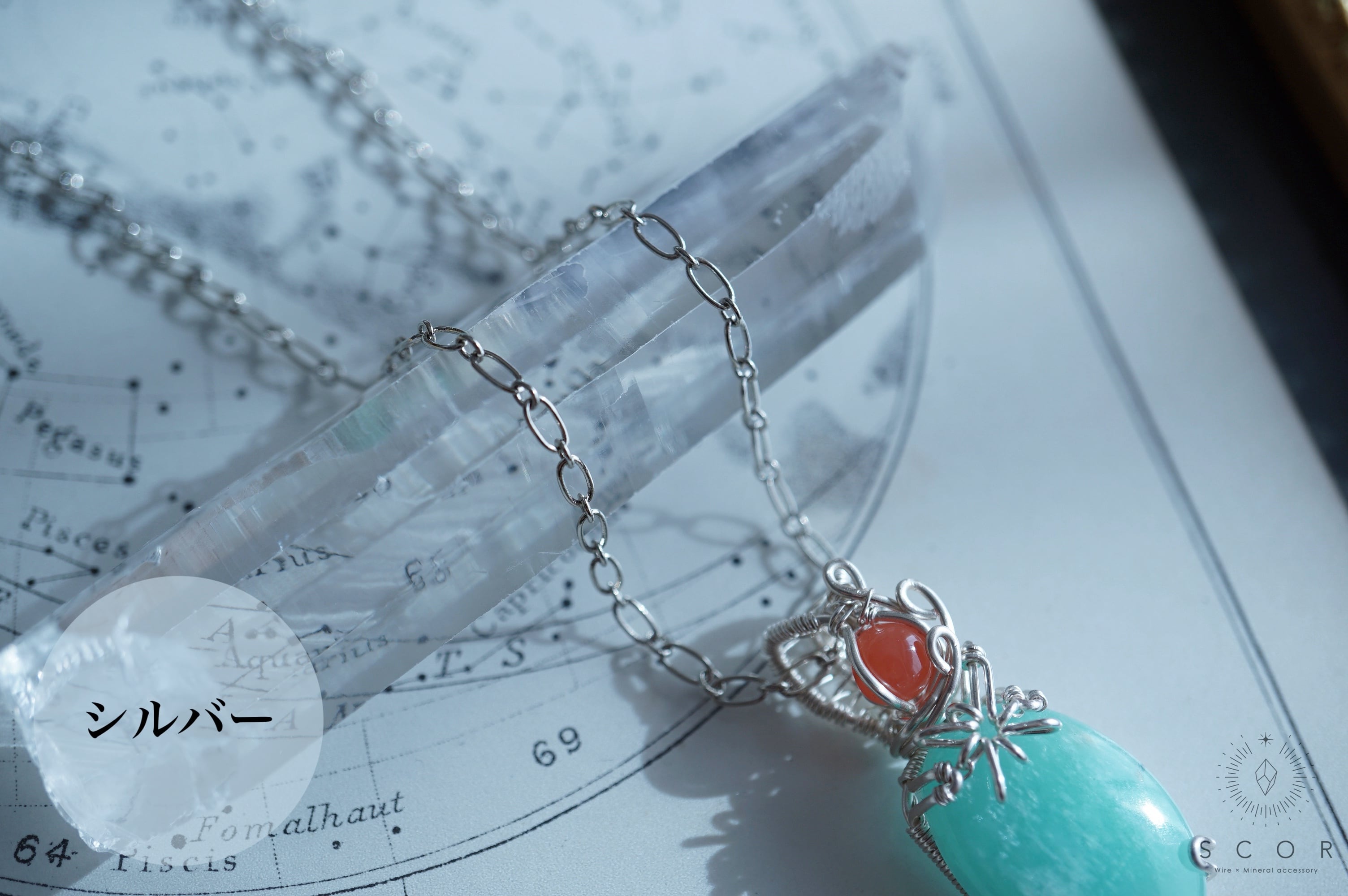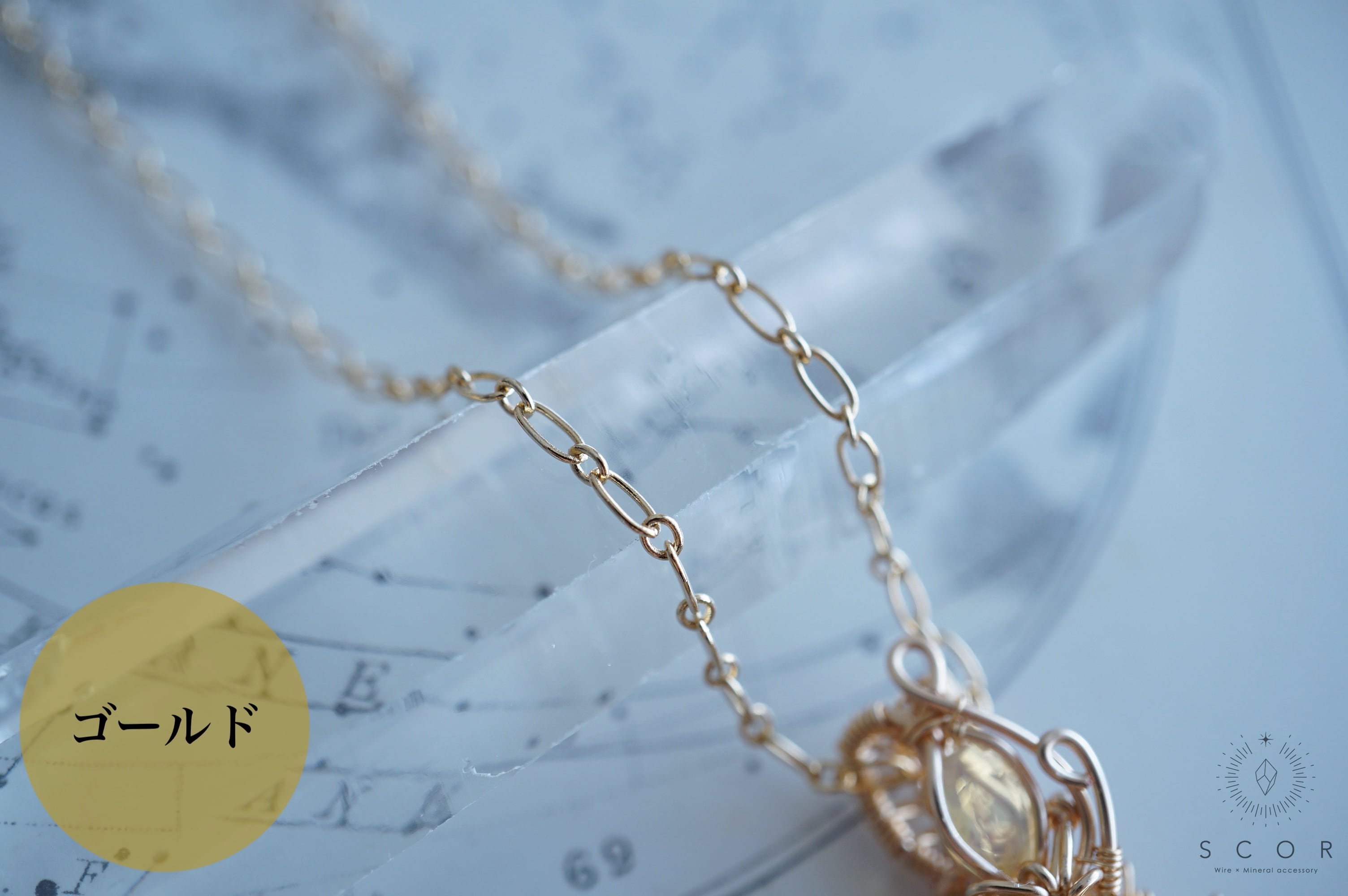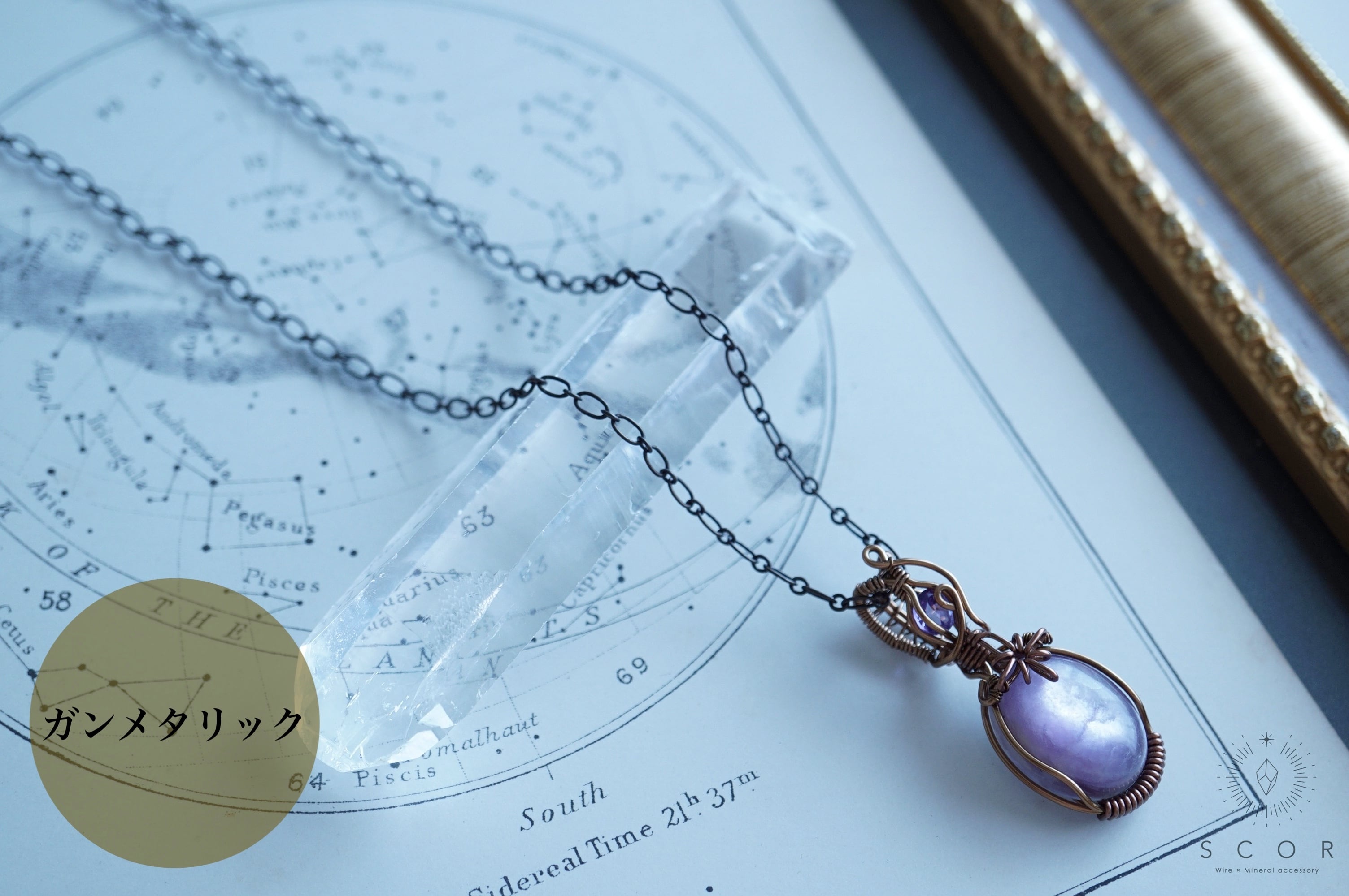 ペンダントトップに使用しているガンメタリックワイヤーとの色合いや、ネックレスを構成する各パーツの色合いにも差異があります。