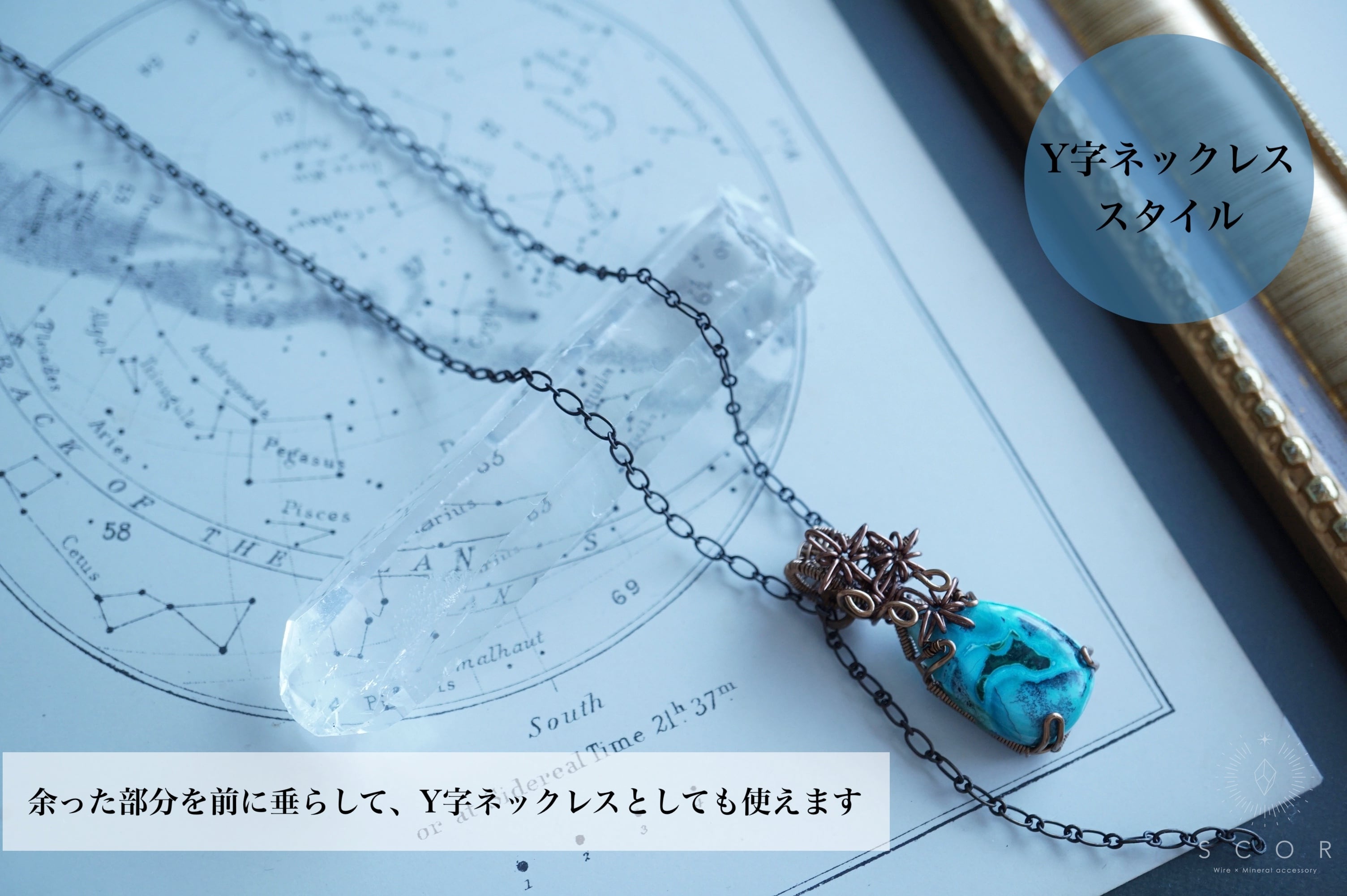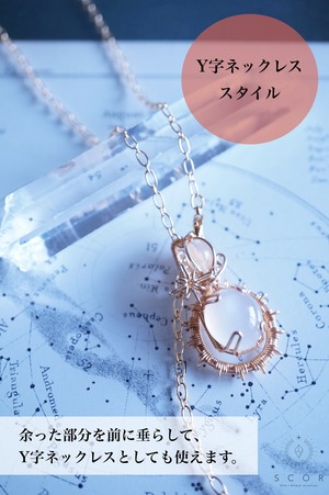 輪っか型のネックレスとしてお使いいただけるほか、ネックレスの余り部分を正面に垂らして、Y字ネックレスとしてもお使いいただけます。