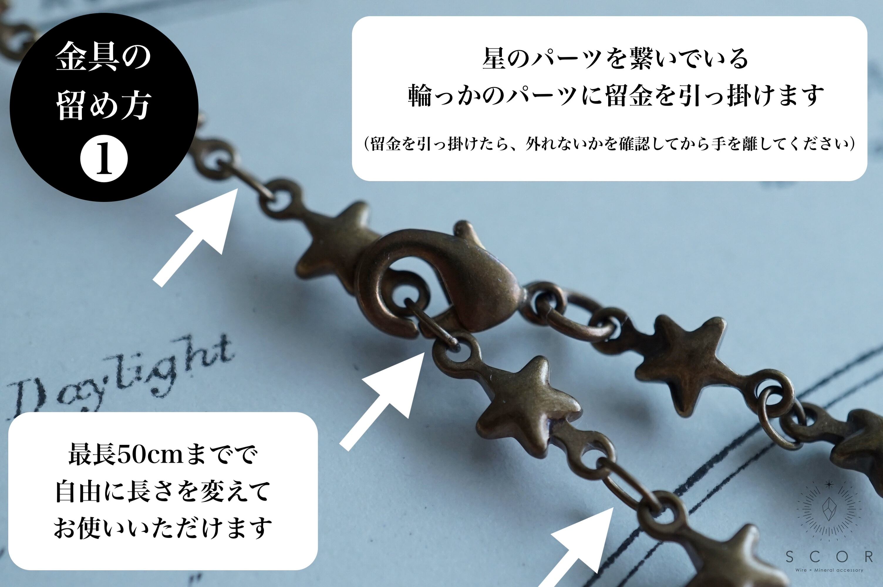留金は、小豆チェーンに引っ掛けるか、お星さまモチーフとお星さまモチーフの間に引っ掛けてください。