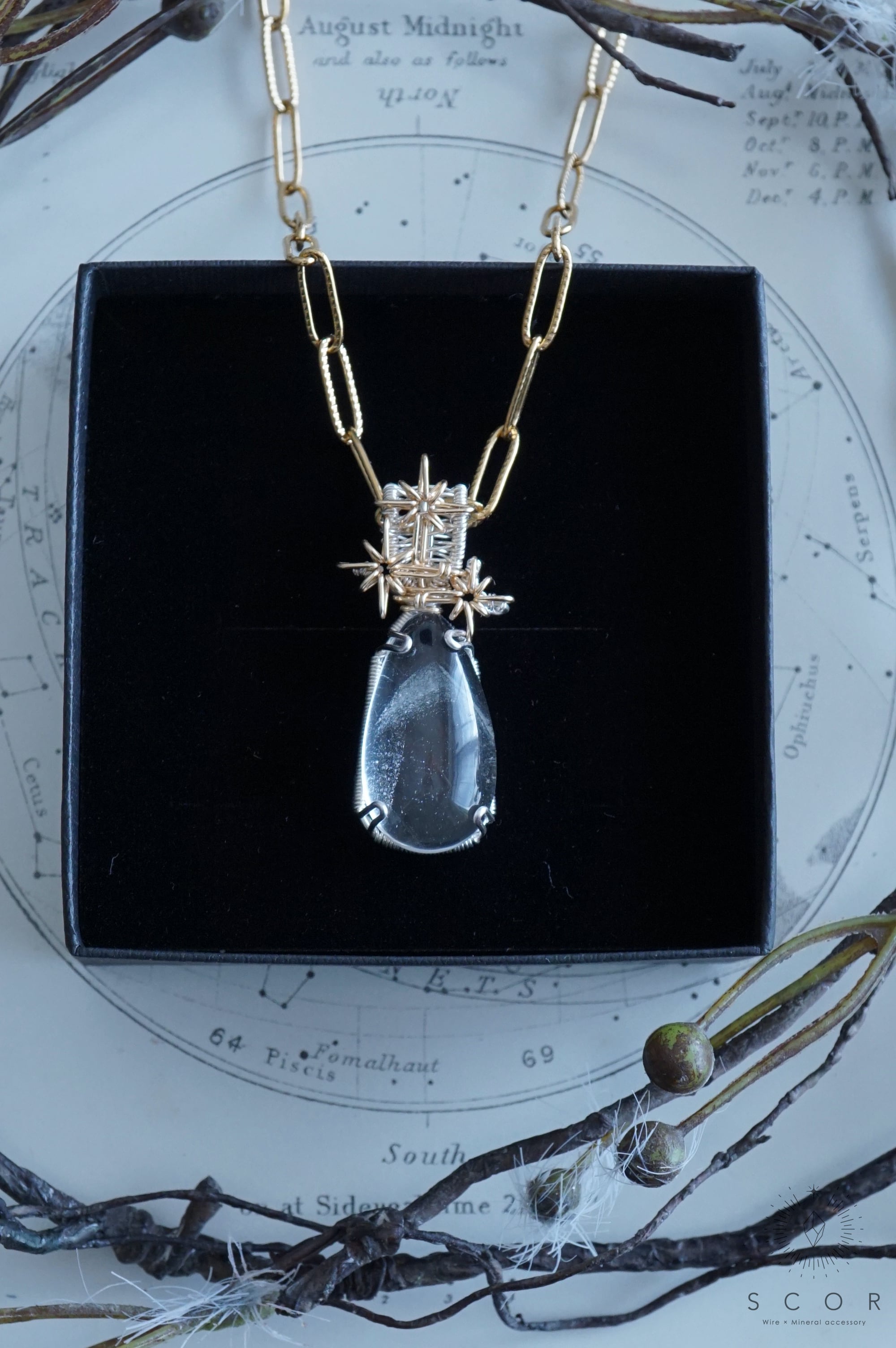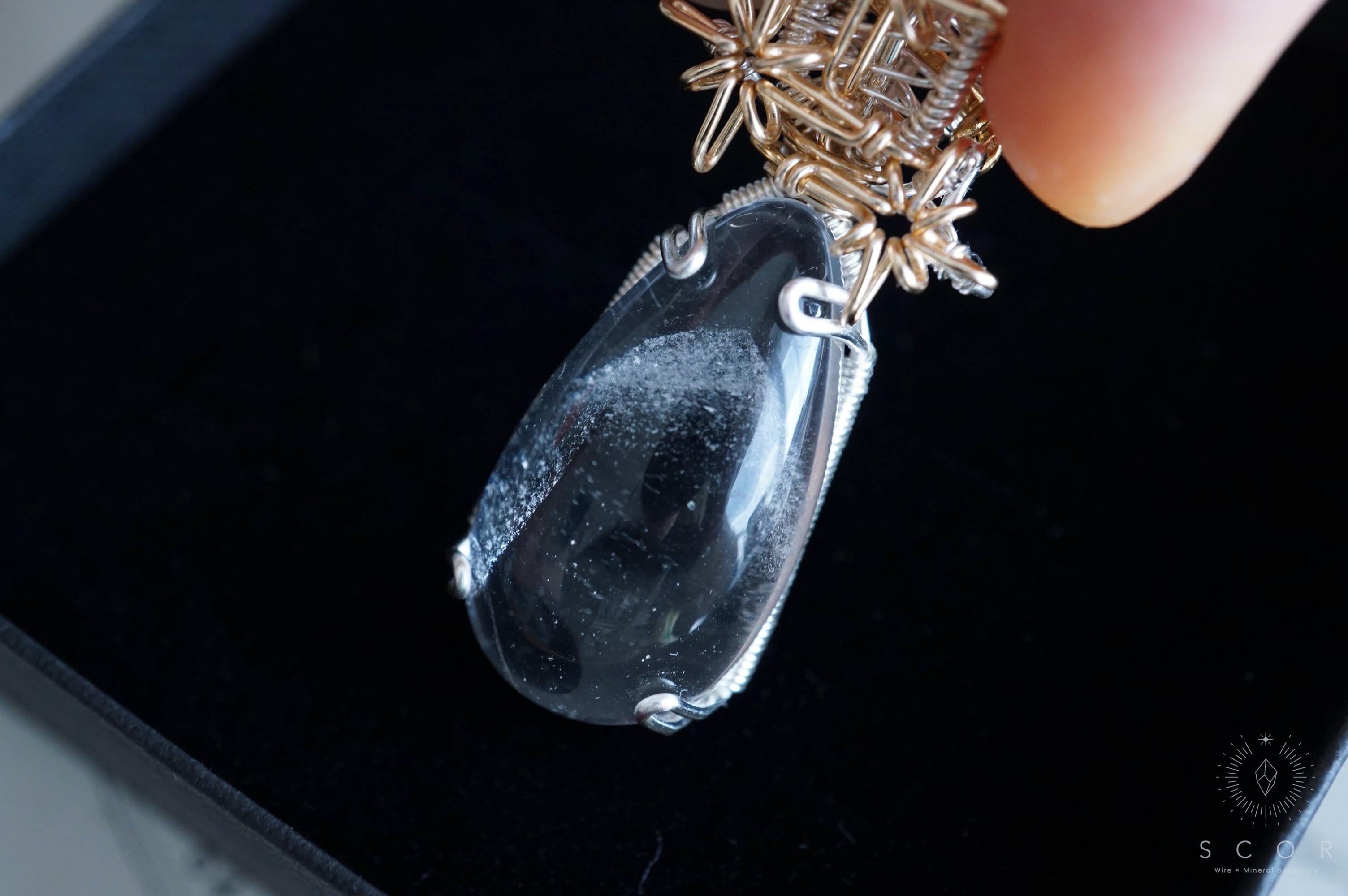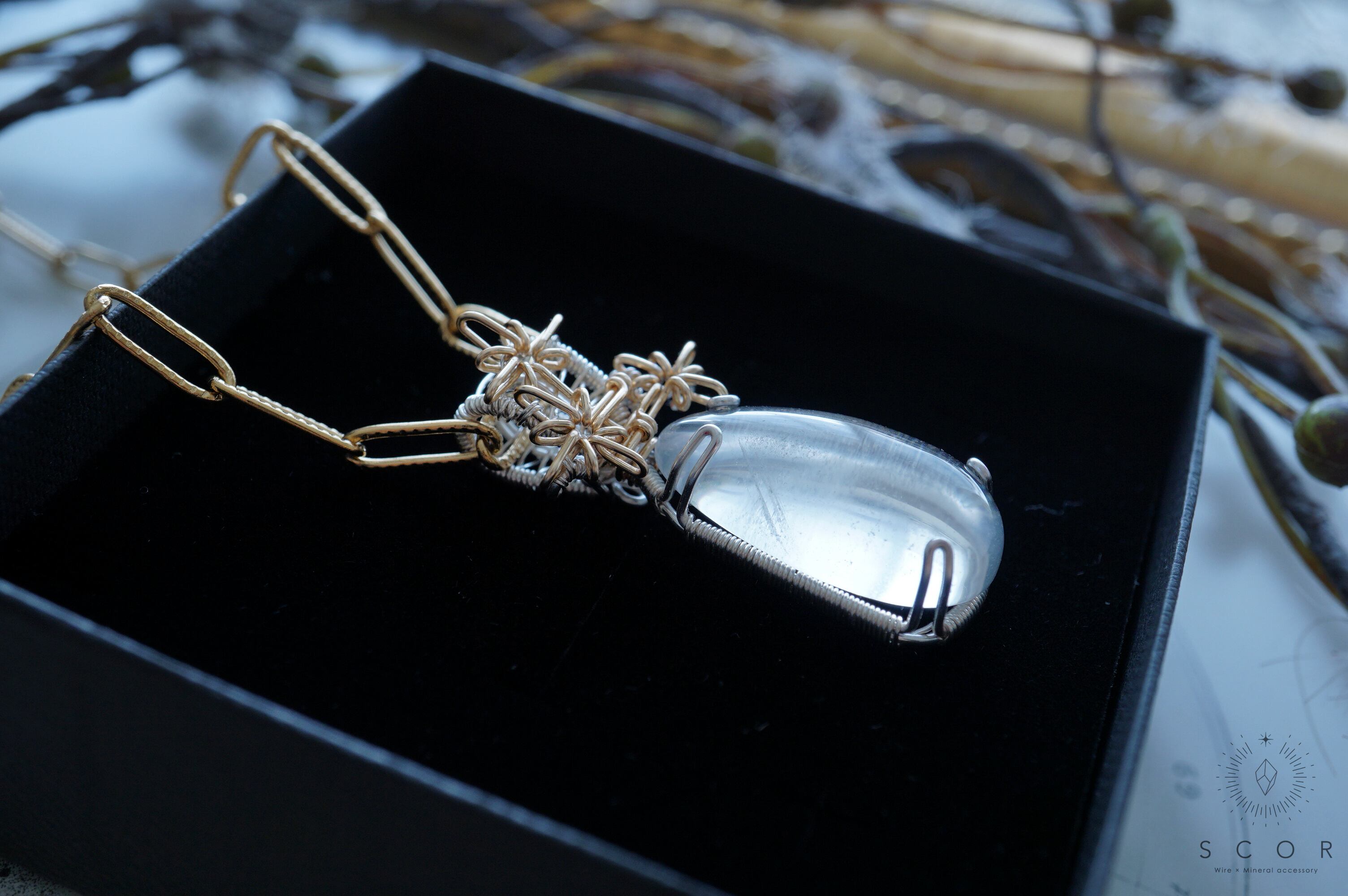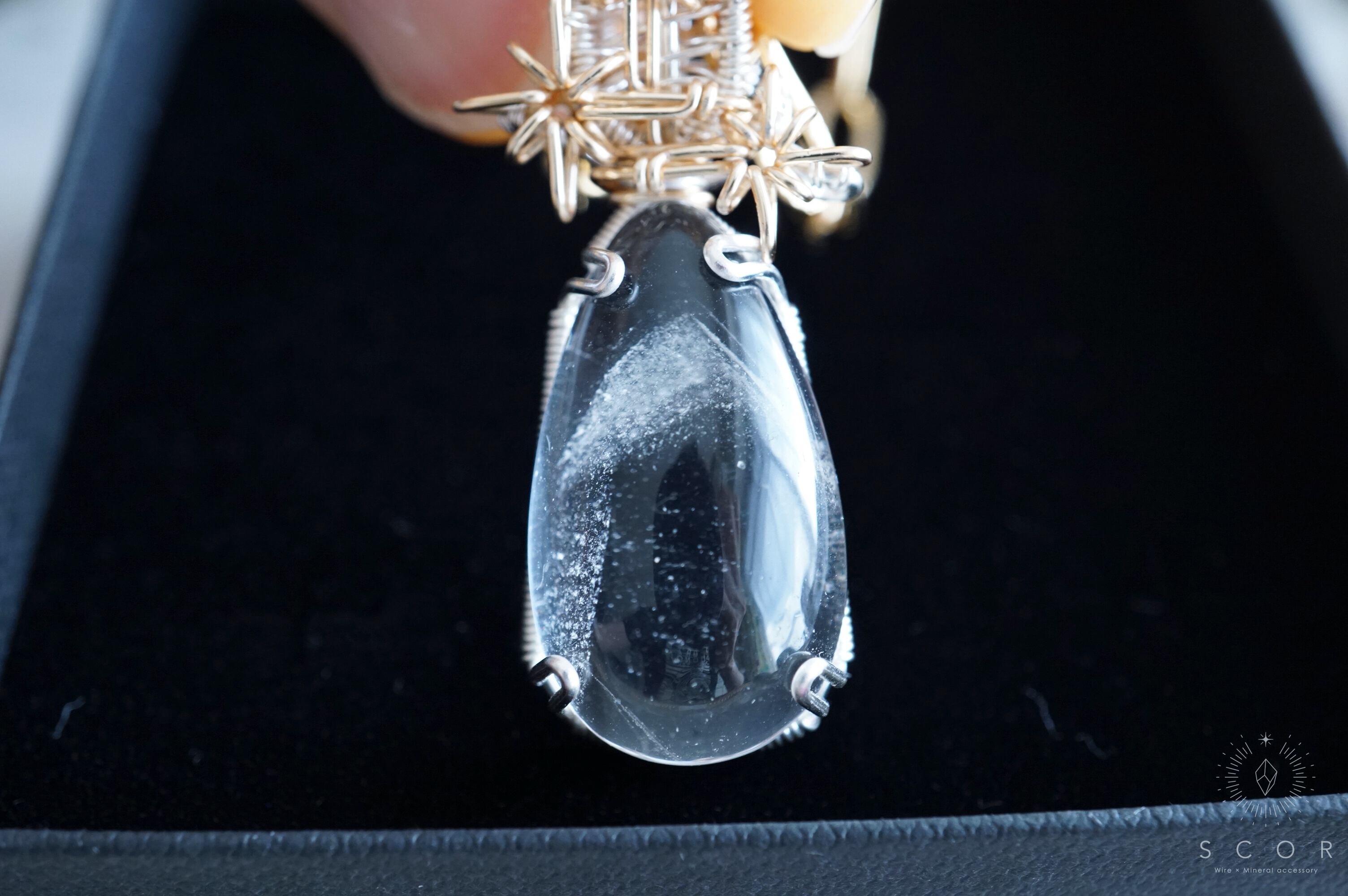 (ホワイトガーデンクオーツとは、白い苔のような内包物が中に見える水晶です。仕入れ時の鉱物名の表記はホワイトガーデンファントムクオーツでしたが、本作に使用したピースには白い苔のような内包物が、肉眼では見て取れなかったため、上記の説明としました)