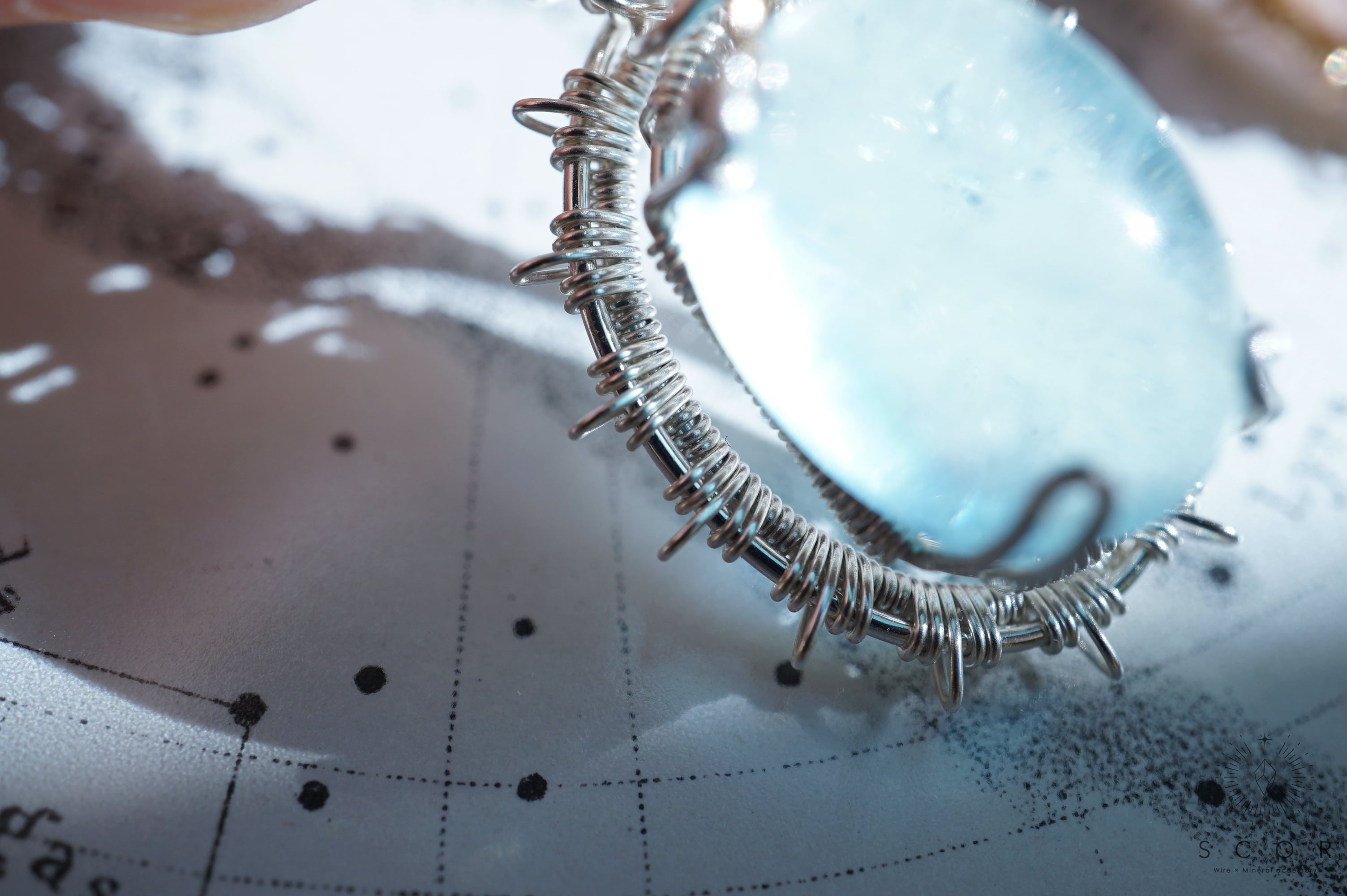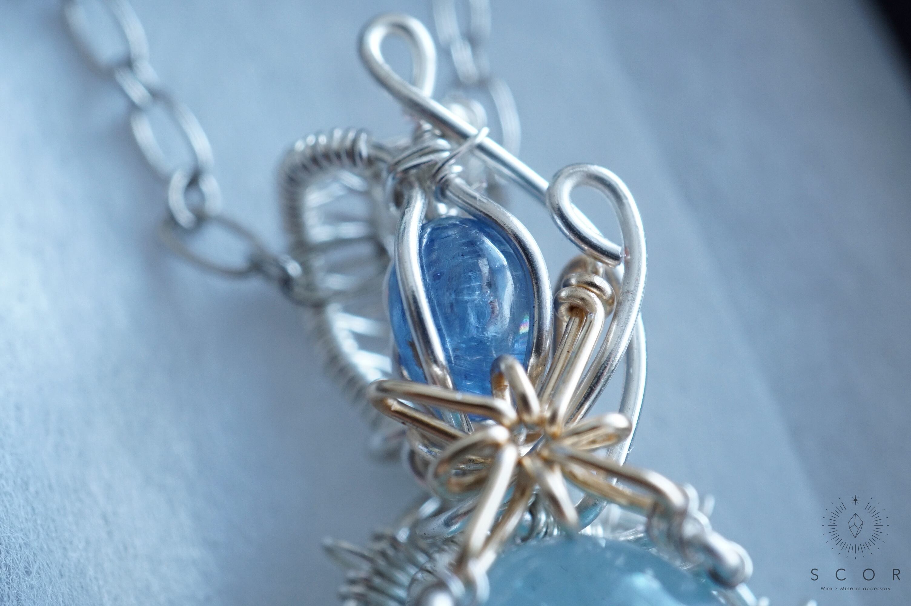 アクアマリンとカイヤナイトの間に配置した光芒型のワイヤーモチーフのみ、ゴールド色のワイヤーで製作しています。