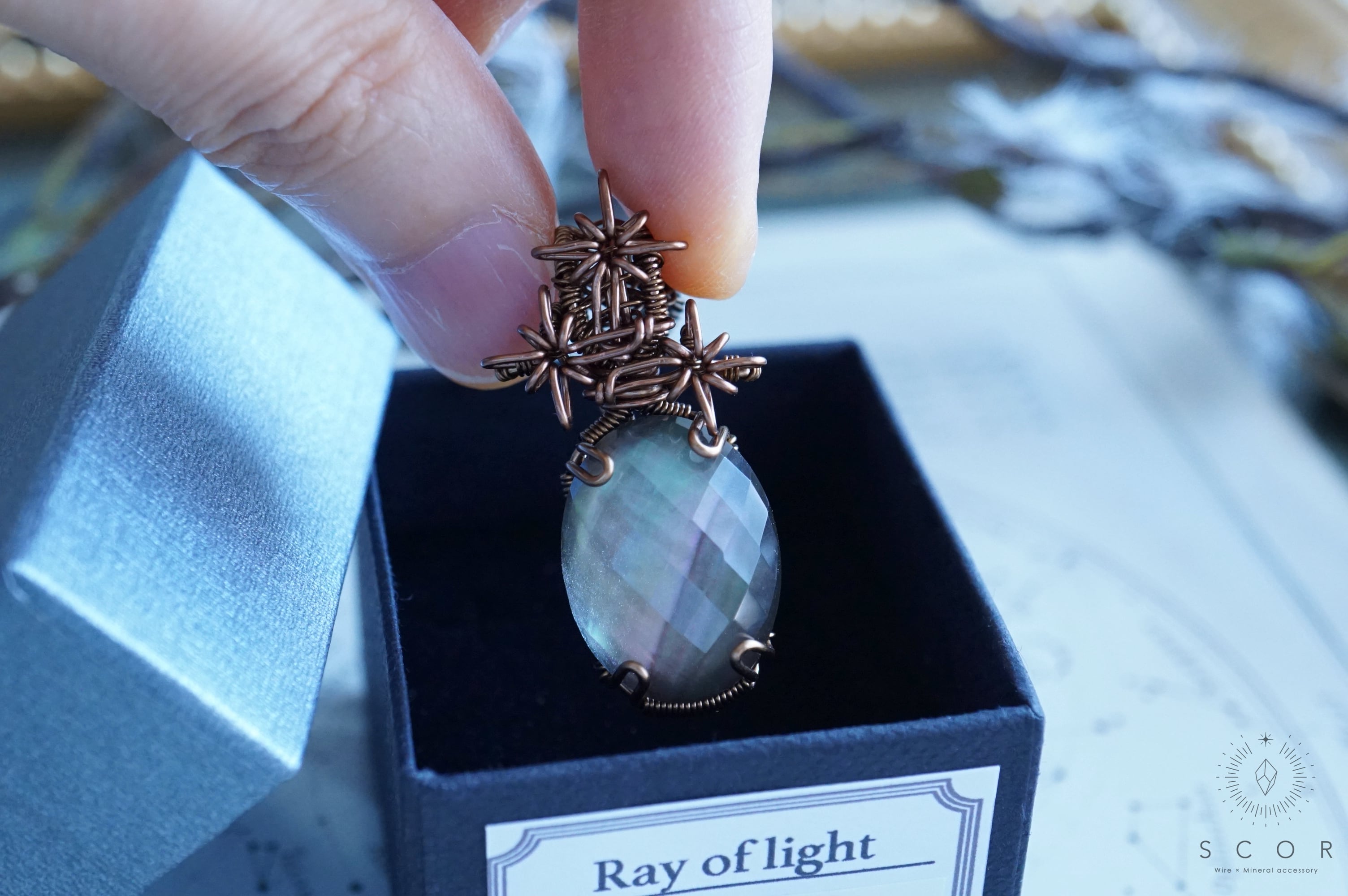 光が当たると、黒蝶貝に反射された光が、内側から水晶の小さな四角形のカット面を照らし、分散した光がオーロラのような緑色とマジェンタピンク色を伴って幻想的に瞬きます。