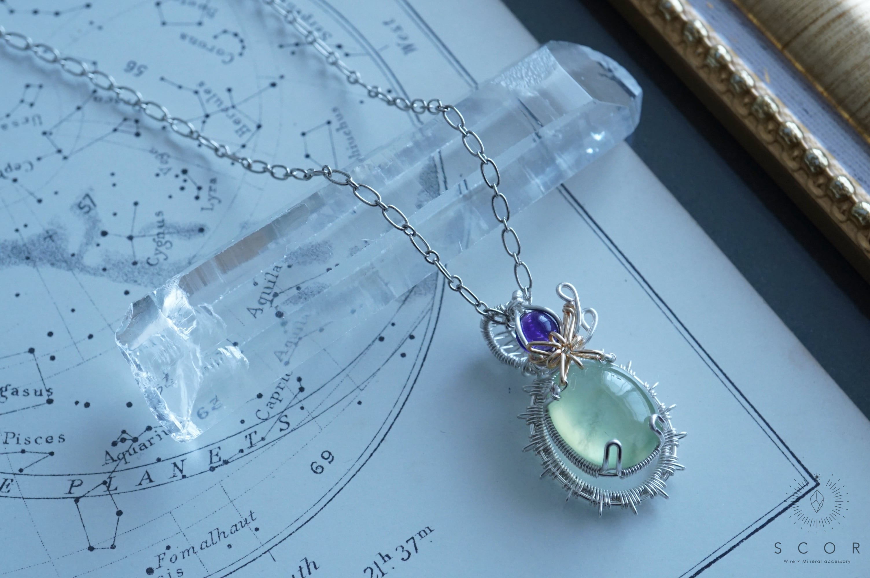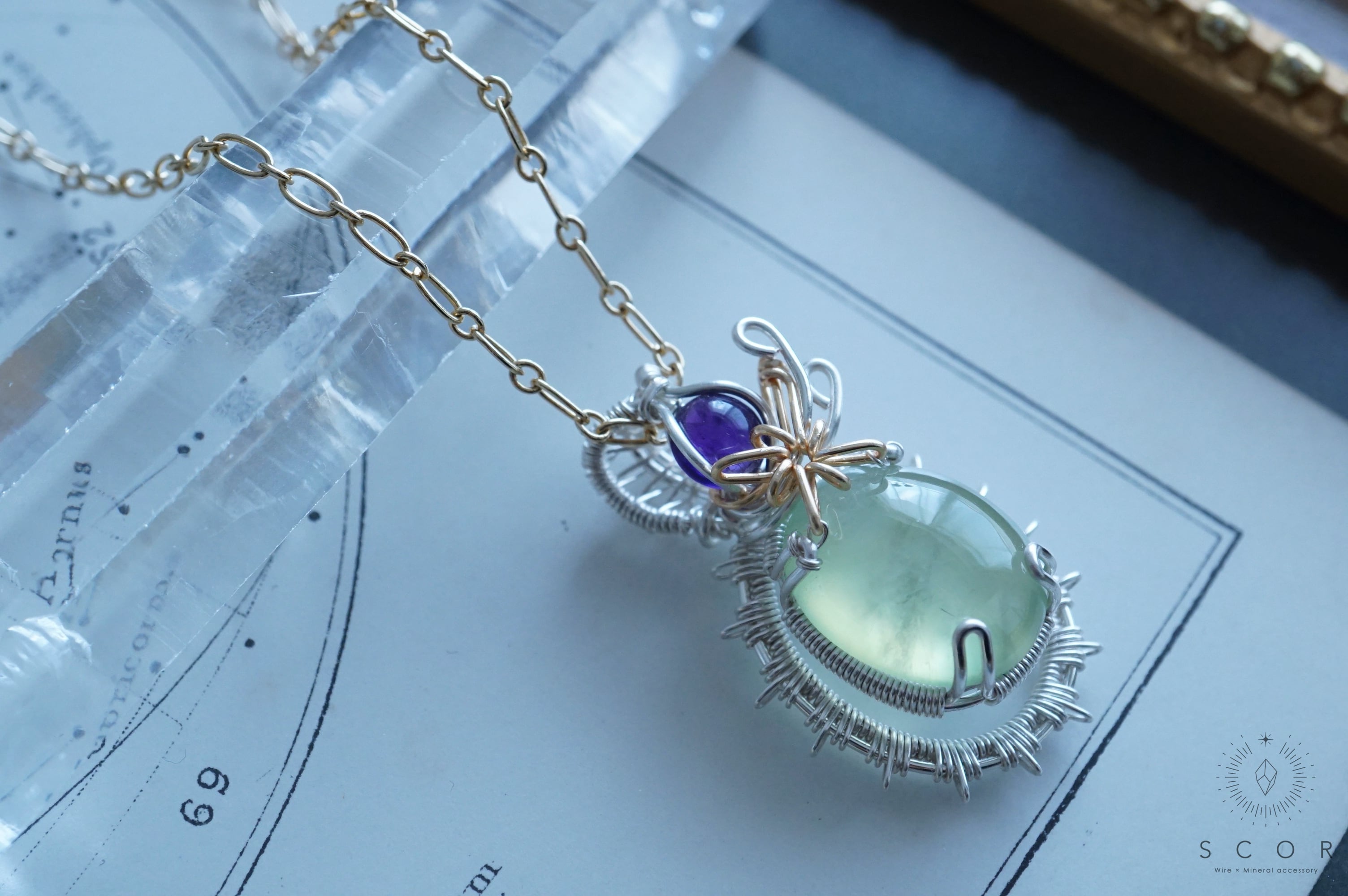 白や淡い色の服と合わせると、プレナイトとアメジストの色合いと透明感が引き立ちます。