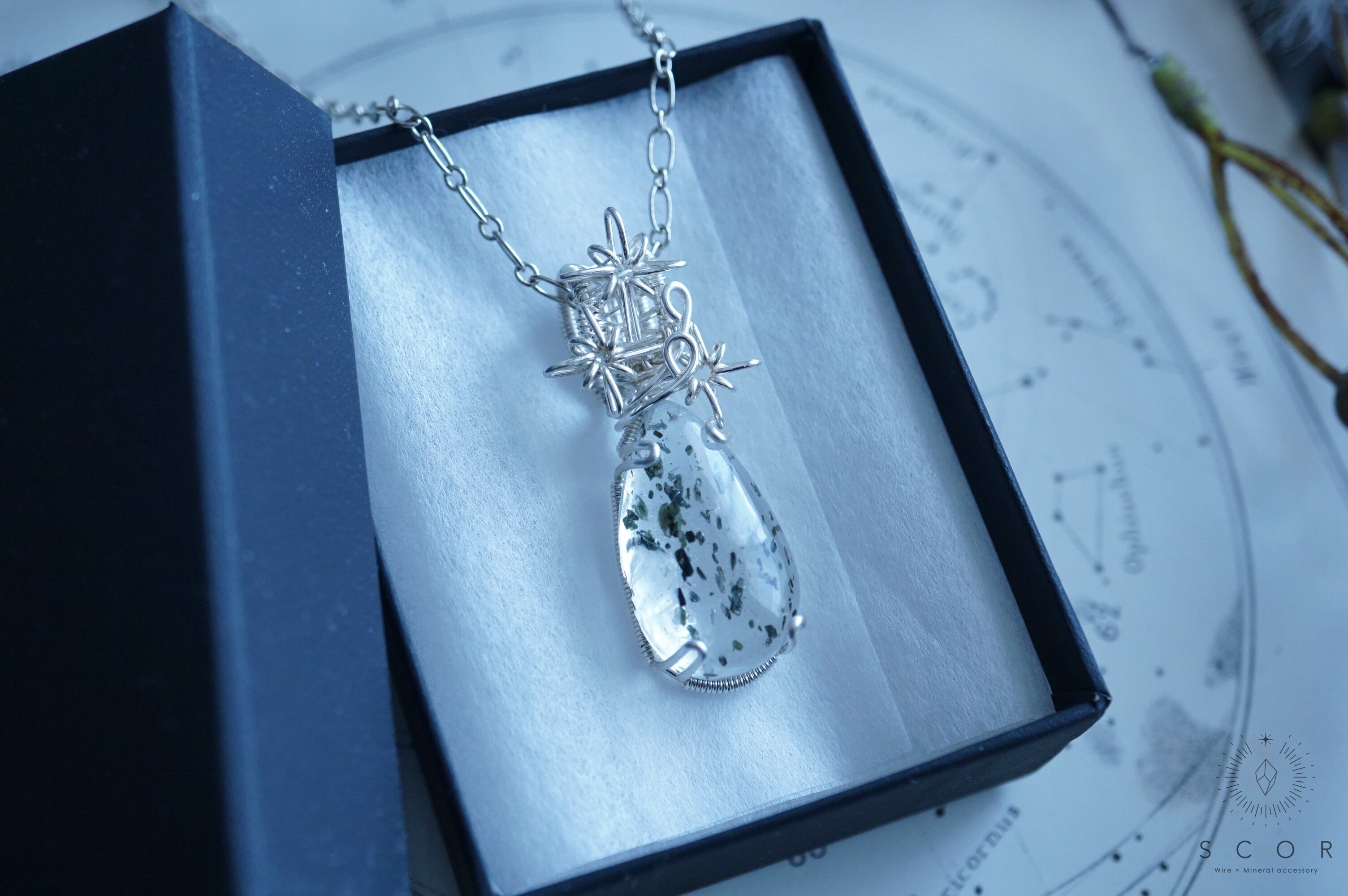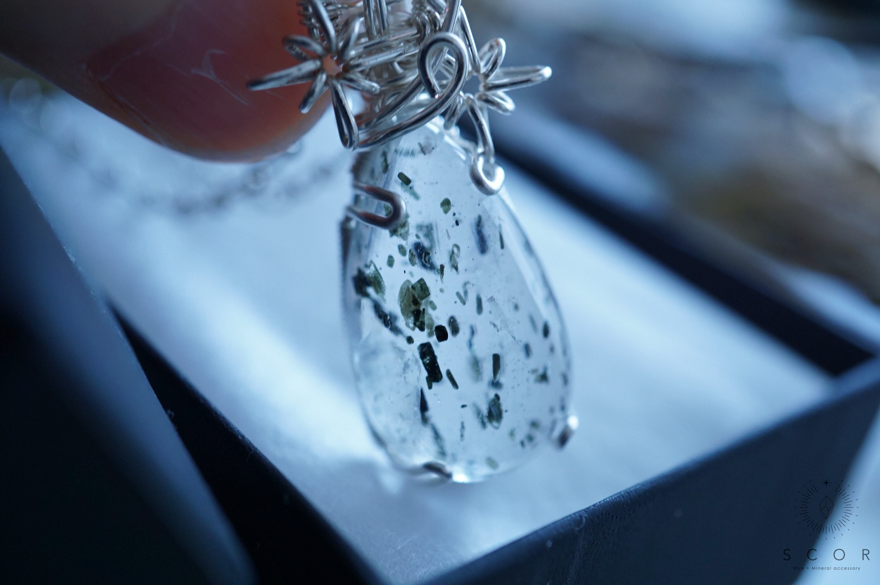 白や淡い色の服と合わせると、マイカinクオーツの透明感とマイカの描く幻想的な模様が引き立ちます。