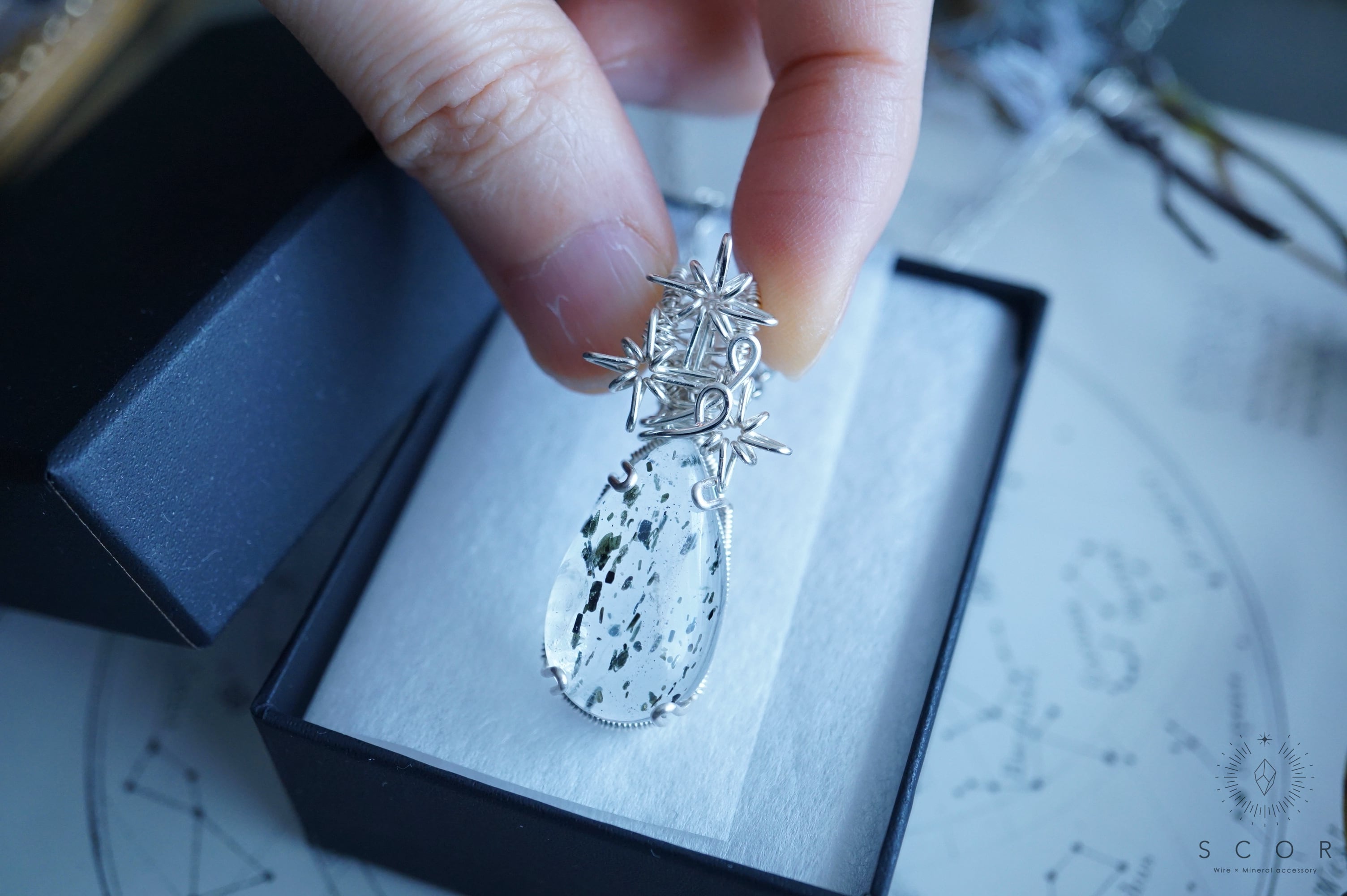 本作では、濃灰色のマイカが無色透明な水晶に内包された、ペアシェイプのカボションを使用。